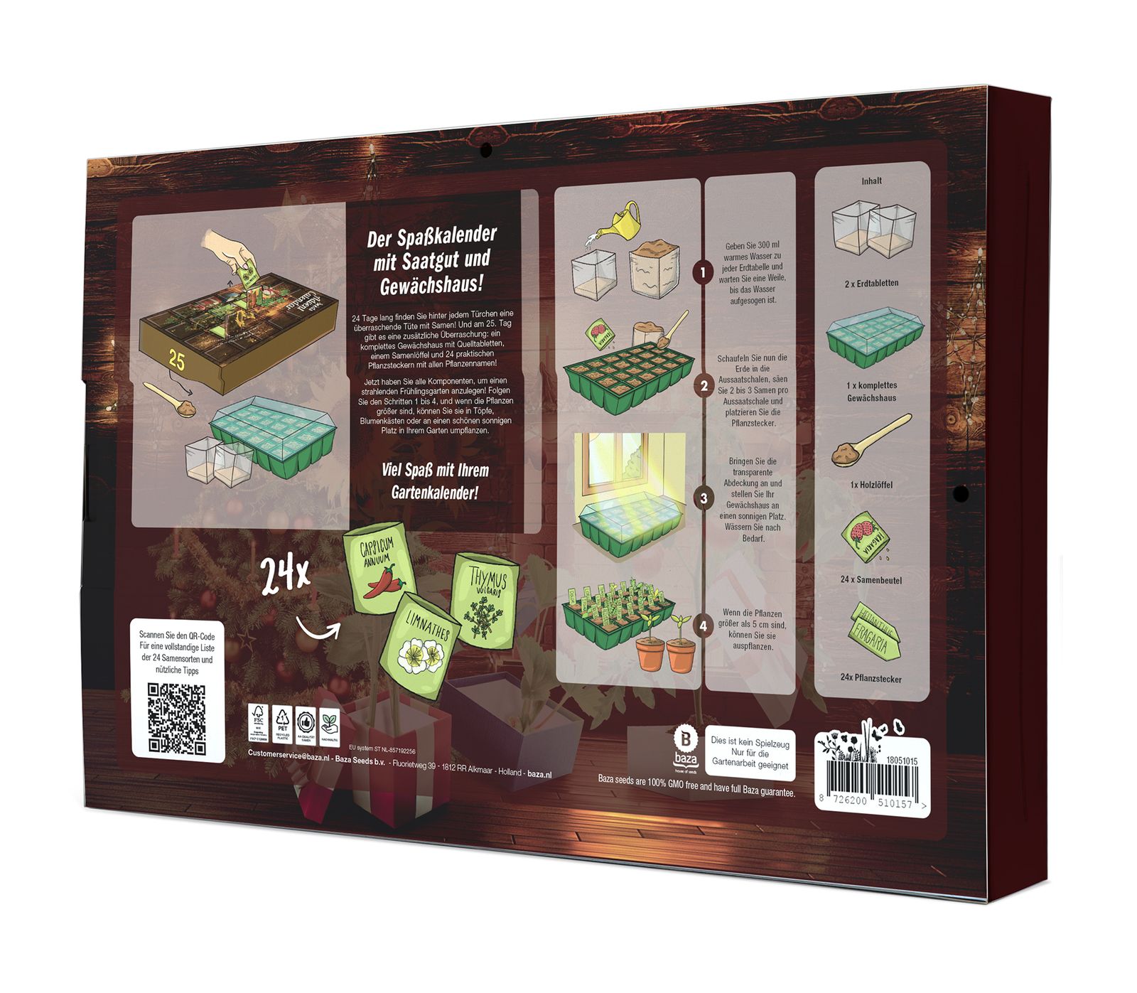 1 Gärtnerei Box 24 Fächer - 1 transparenter Gewächshaus-Deckel - 24 Saatguttüten, die mindestens 2 Jahre haltbar sind - 24 herausnehmbare Pflanzenstecklinge - 2 Tabletten Cocopress-Erde a 1 ltr - 1 hölzerner Saatgutlöffel - 1 vollfarbige Schachtel mit Pflanzanweisungen