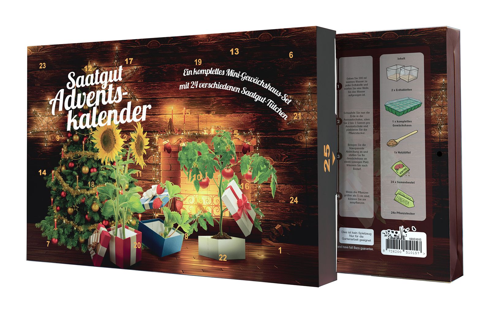 Eine originelle Vorweihnachtsüberraschung für Gärtner und Kinder ist der Weihnachtskalender „Gartengeschenke“. Jeden Tag kann eins der 24 Türchen mit Saatgut geöffnet werden. Hinter den Türchen verbergen sich Samen für Kräuter, Blumen und Gemüse. Dazu bringt der Adventskalender ein Gewächshaus mit Deckel, das Anzuchtsubstrat und Stecketiketten für die Beschriftung mit. So bringt der Kalender schon Vorfreude auf die nächste Gartensaison.