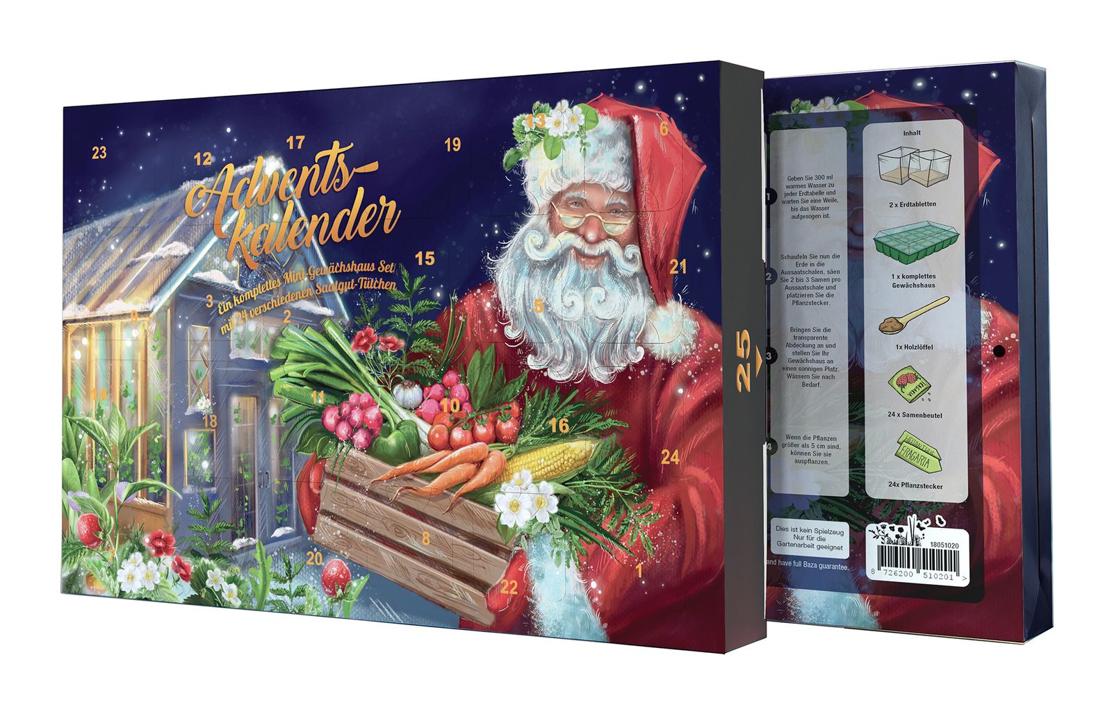 Adventskalender für Gärtner sind originelle Geschenke. Der Kalender „Weihnachtsmann“ verbirgt nicht nur hinter jedem Türchen ein kleines Samentütchen mit Gemüse-, Kräuter- oder Blumensamen. Er bringt auch ein 2-teiliges Gewächshaus, Anzuchtsubstrat, einen Saatgutlöffel und Stecketiketten mit. Die Samen können sofort ausgesät werden. Der bunte Kalender ist nicht nur für erfahrene Gärtner eine Überraschung in der Vorweihnachtszeit. Auch Gartenanfänger und Kinder freuen sich über den nachhaltigen Weihnachtskalender voller Spannung auf die nächste Gartensaison.