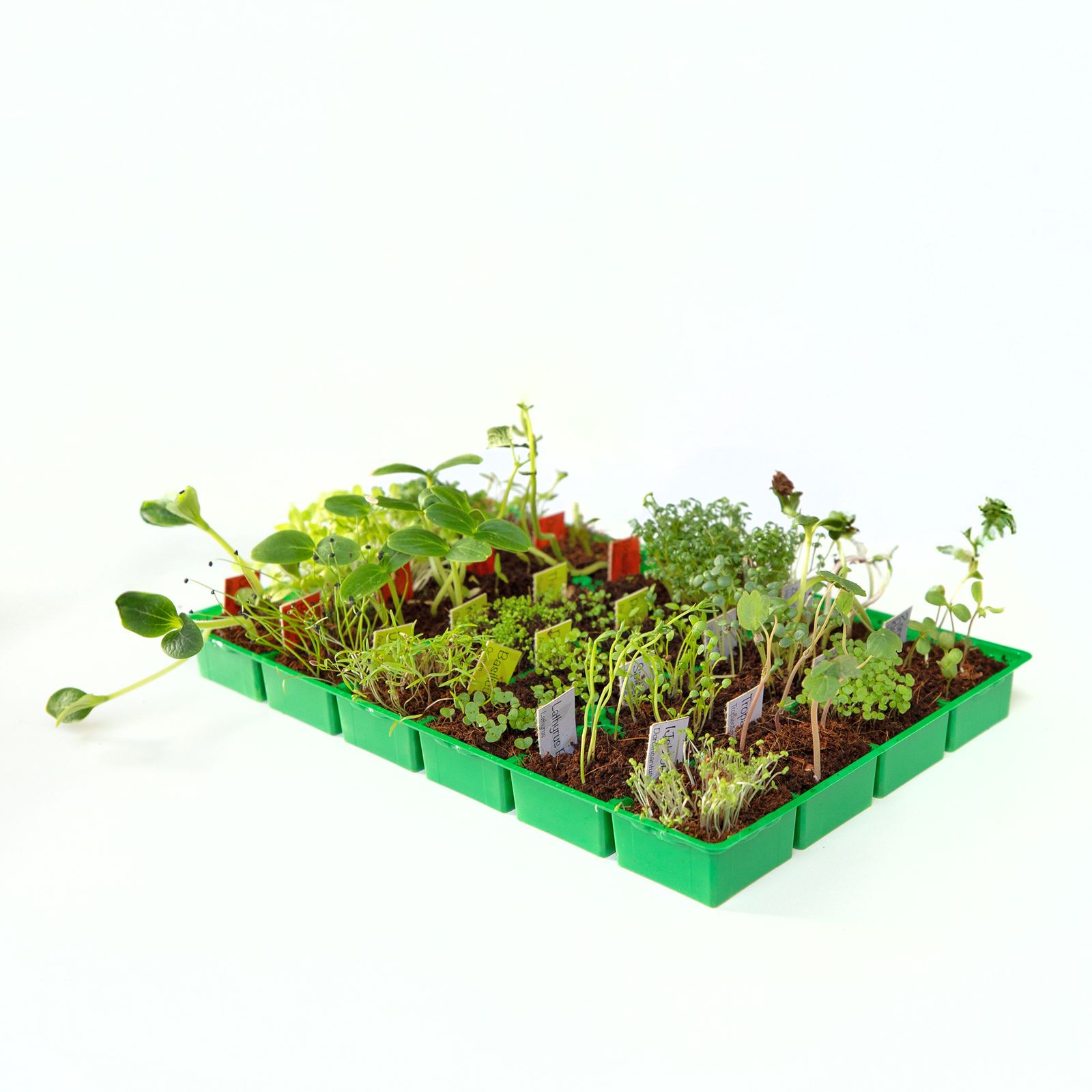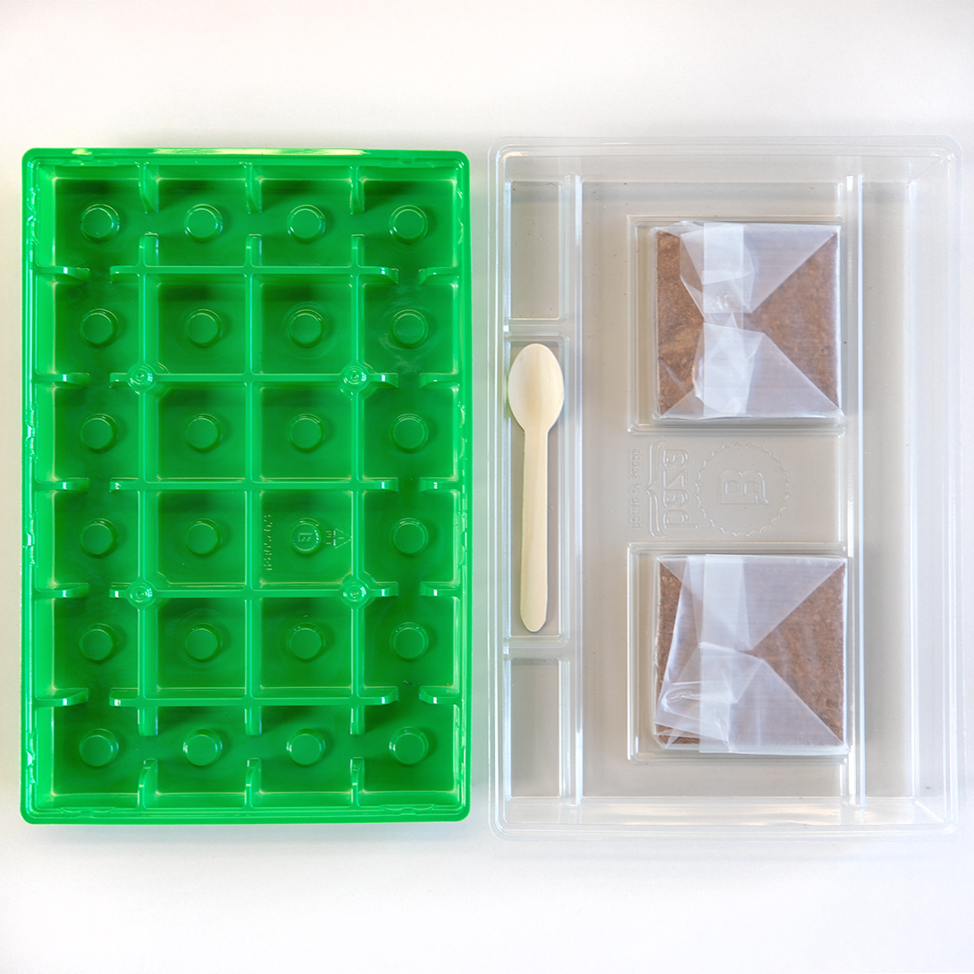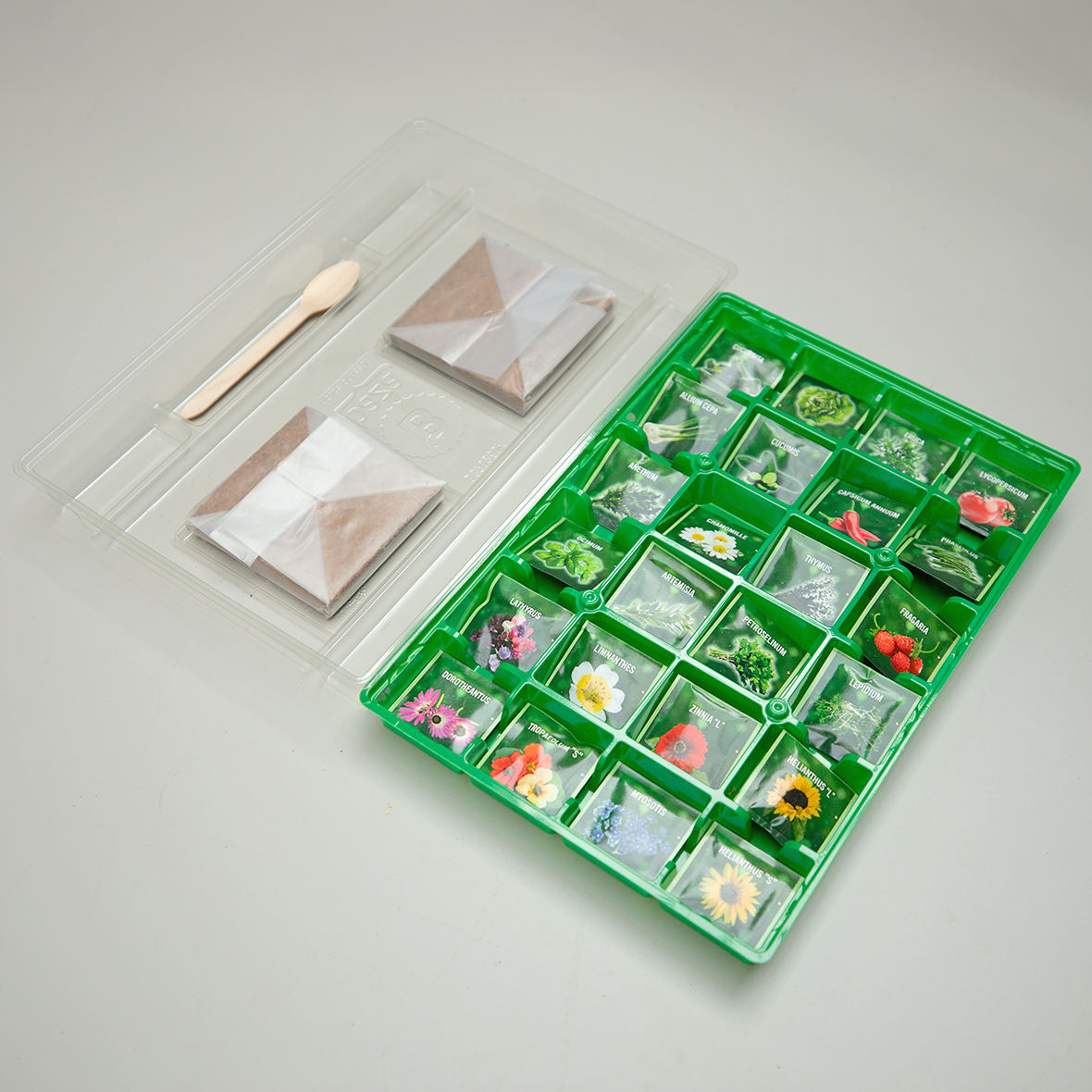 1 Anzuchtbox mit 24 Fächern - 1 transparenter Gewächshausdeckel - 24 Saatgut Tüten, die mindestens 2 Jahre haltbar sind - 24 herausnehmbare Pflanzenstecklinge - 2 Kokosquelltabletten für je 1 L Erde - 1 hölzerner Saatgutlöffel - 1 vollfarbige Schachtel mit Pflanzanweisungen