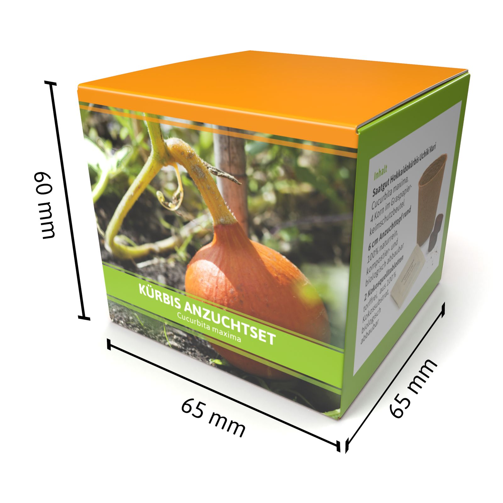 Wussten Sie, dass der Kürbis die Fruchtbarkeit symbolisiert? Eine fruchtbare Zusammenarbeit mit Geschäftspartnern oder Kunden wünscht sich sicher jedes Unternehmen. Mit dem Anzuchtset Kürbis treffen Sie ins Schwarze. Das Anzuchtset bringt alles mit, was Ihre Kunden und Geschäftspartner für die Anzucht eines Kürbisses benötigen: Anzuchttopf, Substrat und das Kürbis-Saatgut. Die schmucke Verpackung enthält nicht nur alle wichtigen Informationen für die Aussaat, sie bietet auch ausreichend Platz für Ihr Logo oder den Werbespruch. Beides können Sie mit einem Aufkleber oder Stempel leicht aufbringen.