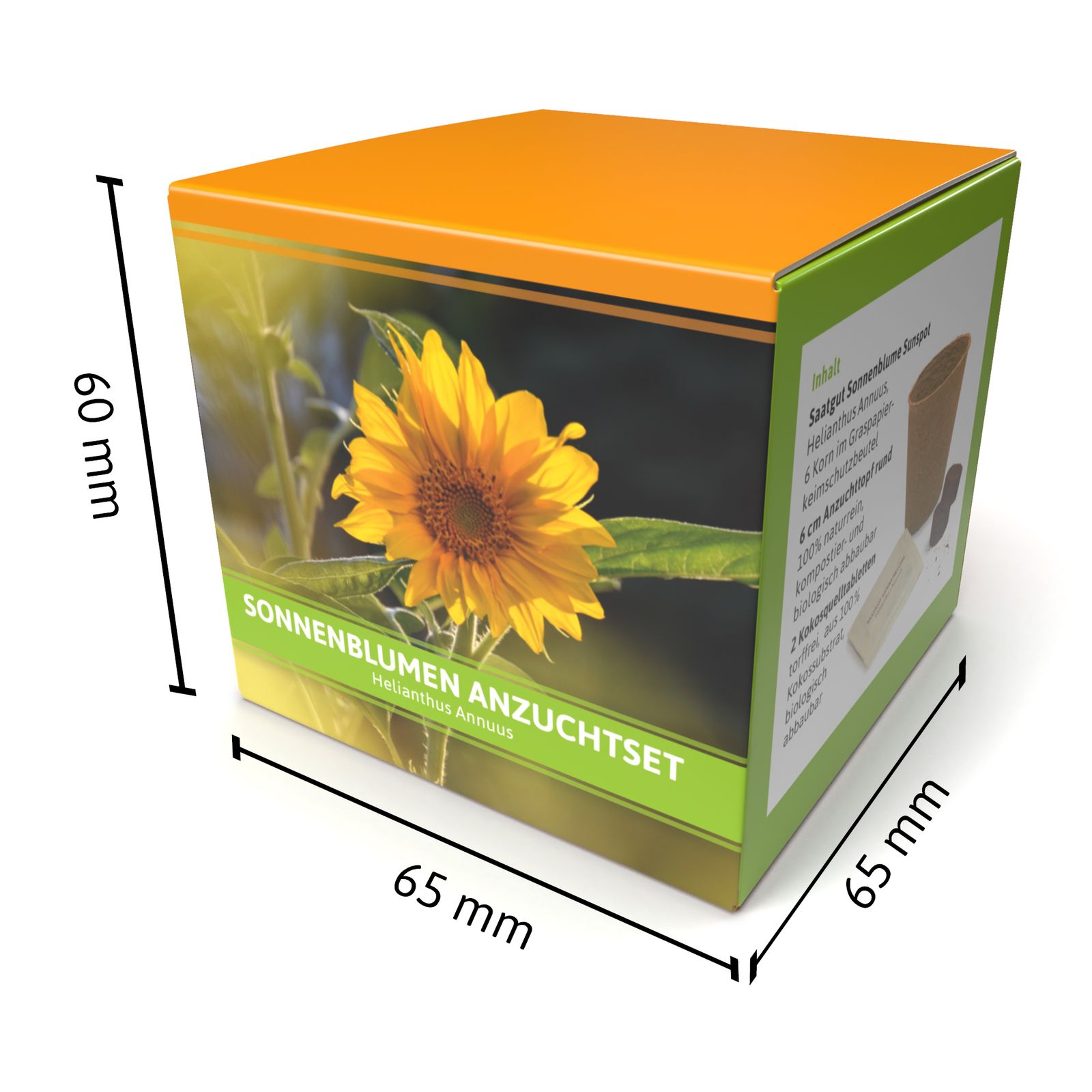 Was könnte besser für die Werbung geeignet sein, als der Samen der Sonnenblume? Die riesige Blume steht für das Leben, die Gesundheit und Weisheit und auch für das Licht. Die mächtige Sonnenblume hat einen ganz besonderen Charme, der viele in ihren Bann zieht. Das Saatgut ist perfekt für die Werbung. Sonnenblumen-Saatgut, Anzuchttopf und Substrat sind im Anzuchtset enthalten. Ihre Kunden und Geschäftspartner brauchen nur noch aussäen und die Pflanze liebevoll zu pflegen, damit sie wie eine gute Partnerschaft gedeihen kann. Auf der Verpackungen finden Sie nicht nur viele Informationen zur Anzucht des Saatguts, Sie können auch Ihr Logo oder den Slogan aufbringen.