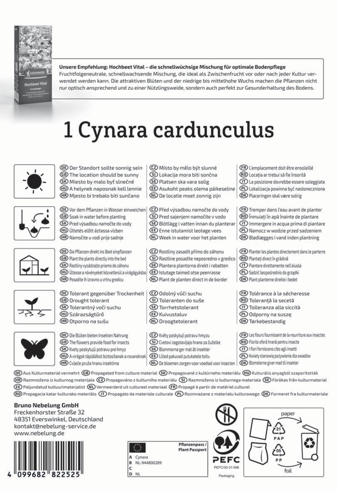 Die mehrjährige Artischoke ist eine Delikatesse der mediterranen, gehobenen Küche. Sie zergehen auf der Zunge, schmecken aromatisch und leicht herb. Als Gemüse wirkt sie verdauungsfördernd und magenstärkend. Geerntet werden die Knospen sobald sich die ersten Schuppen abspreizen. Dank der dekorativen Blüten, auch als Zierstaude zu empfehlen. Nach der Erntezeit ist die Pflanze mit Winterschutz bedingt winterhart. Anbau im Kübel ist möglich, wichtig ist hier ein Kübeldurchmesser von mind. 50 cm. Ernte im selben Jahr der Anpflanzung möglich.