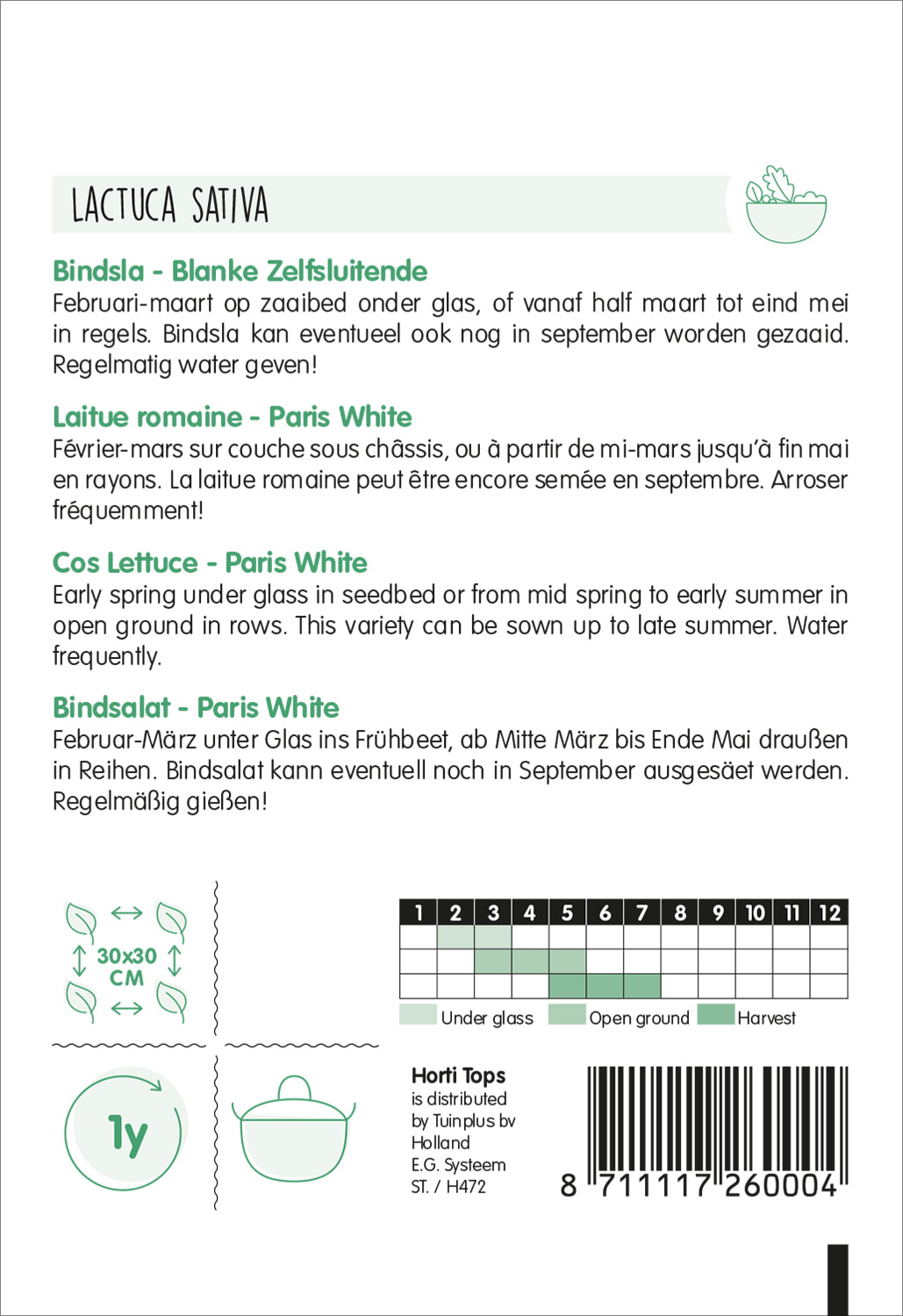 Februar-März unter Glas ins Frühbeet, ab Mitte März bis Ende Mai draußen in Reihen. Bindsalat kann eventuell noch in September ausgesät werden. Regelmäßig gießen!
