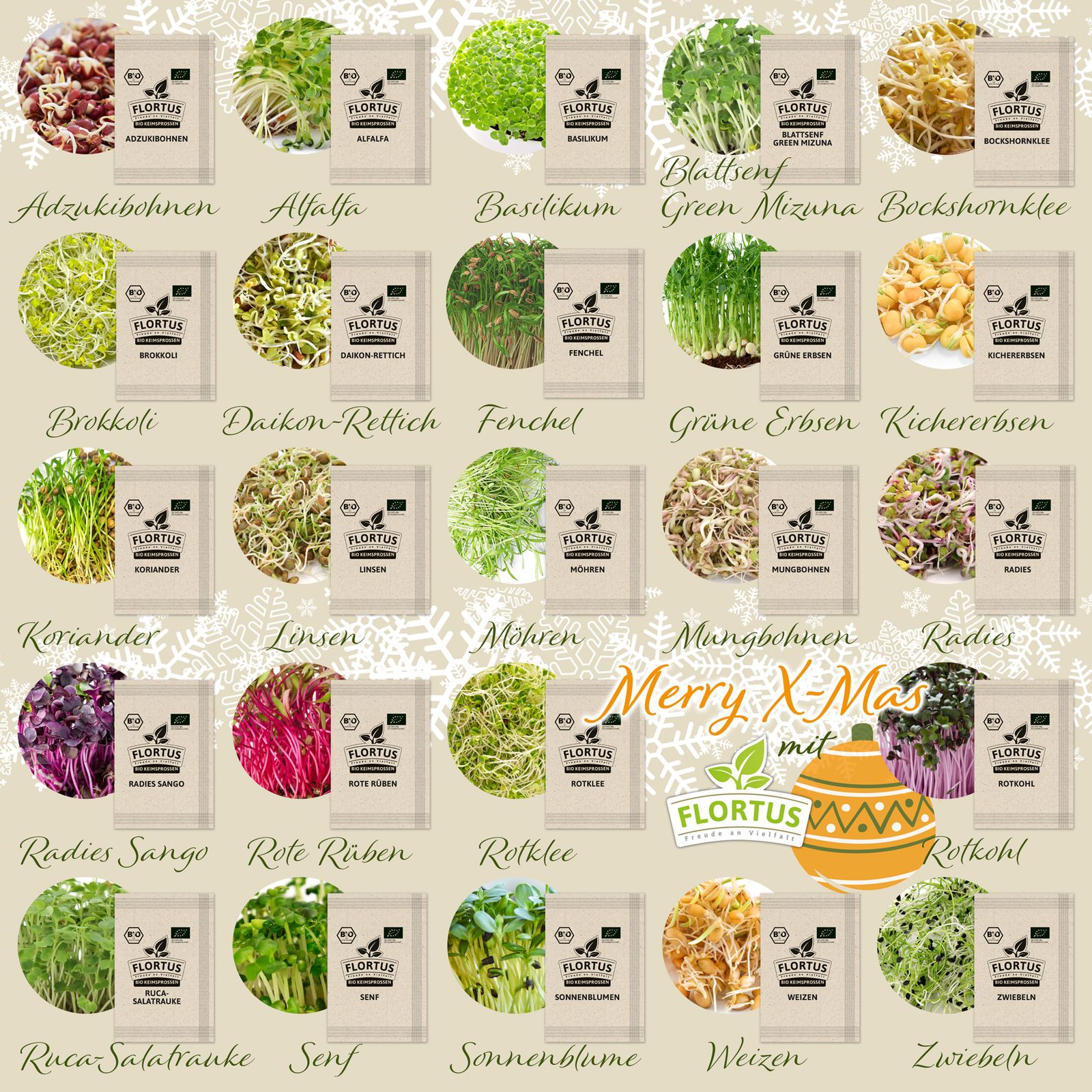 Selbst große Hobbygärtner freuen sich auf 24 Türchen voller Überraschungen. Mit dem FLORTUS Saatgut-Adventskalender BIO Keimsprossen können Sie Liebhaber der Keimsprossen überraschen. Der nachhaltige Adventskalender ist etwas ganz Besonderes, denn er ist vollständig ohne Plastik hergestellt und kann komplett genutzt werden. Hinter den 24 Türchen versteckt sich Saatgut für die Anzucht von 24 Keimsprossen-Arten. Das Saatgut hinter jedem Türchen reicht aus, um einmal die Keimschale oder das Sprossenglas zu befüllen. Sind alle Türchen geöffnet, können Sie das Inlay, das aus einer Frischefaser besteht, als Pflanzenbeet nutzen. Lassen Sie einfach bunte Blumen blühen oder frische Kräuter für die Küche wachsen. Nachhaltiger kann ein Adventskalender nicht sein.