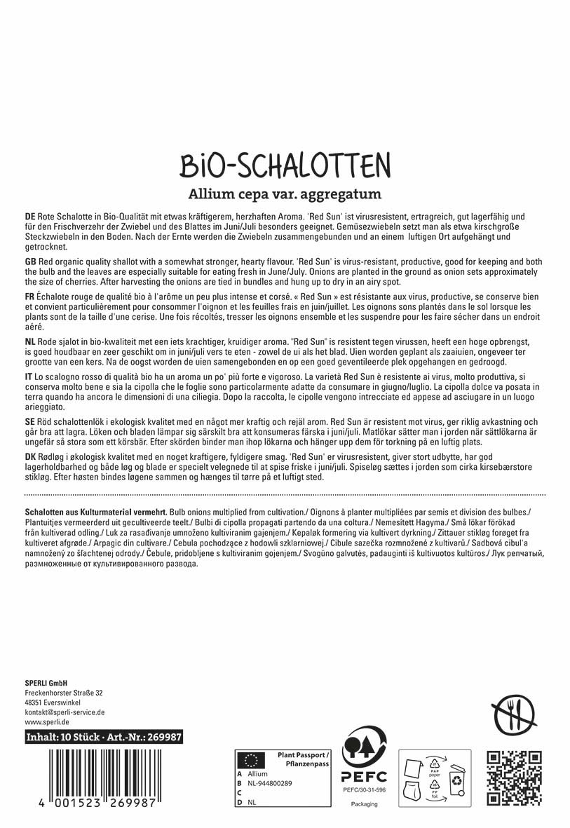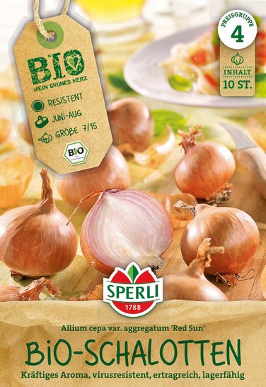 Rote Schalotte in Bio - Qualität mit etwas kräftigerem, herzhaften Aroma. Red Sunist virusresistent, ertragreich, gut lagerfähig und für den Frischverzehr der Zwiebel und des Blattes im Juni / Juli besonders geeignet. Gemüsezwiebeln setzt man als etwa kirschgroße Steckzwiebeln in den Boden. Nach der Ernte werden die Zwiebeln zusammengebunden und an einem luftigen Ort aufgehängt und getrocknet.