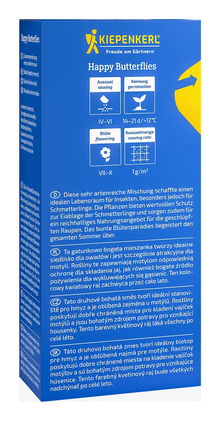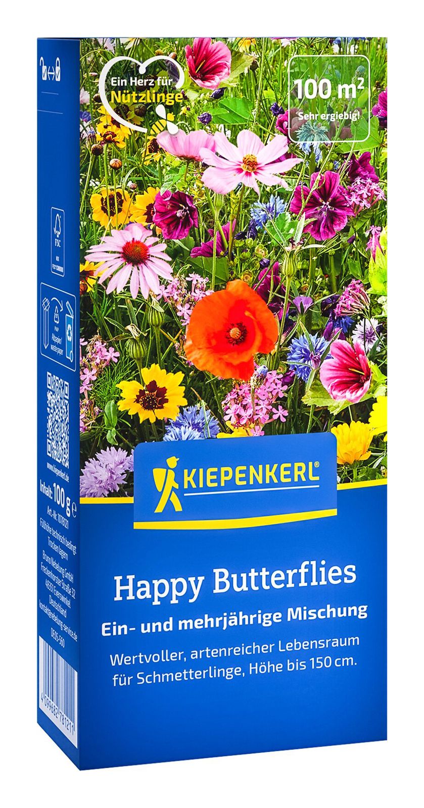 Diese sehr artenreiche Mischung schafft einen idealen Lebensraum für Insekten, besonders jedoch für Schmetterlinge. Die Pflanzen bieten wertvollen Schutz zur Eiablage der Schmetterlinge und sorgen zudem für ein reichhaltiges Nahrungsangebot für die geschlüpften Raupen. Das bunte Blütenparadies begeistert den gesamten Sommer über.