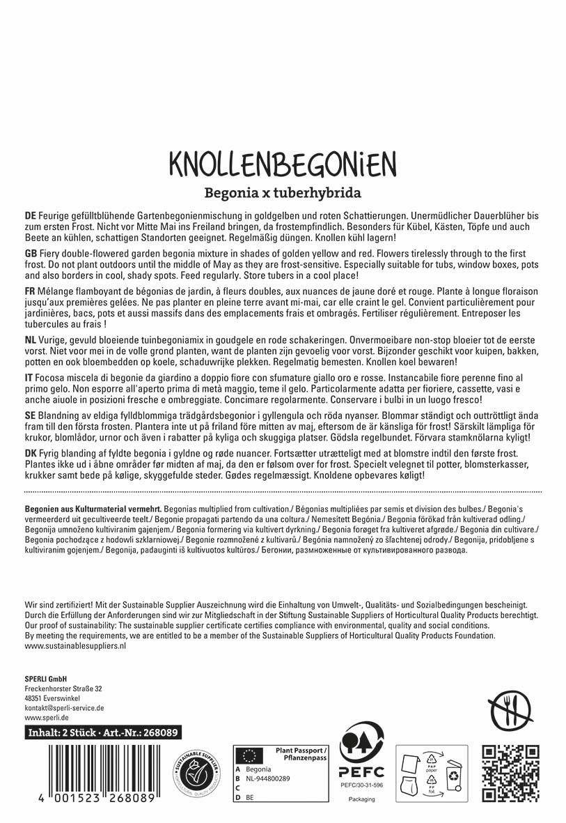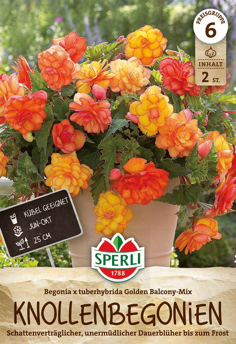 Feurige gefülltblühende Gartenbegonienmischung in goldgelben und roten Schattierungen. Unermüdlicher Dauerblüher bis zum ersten Frost. Nicht vor Mitte Mai ins Freiland bringen, da frostempfindlich. Besonders für Kübel, Kästen, Töpfe und auch Beete an kühlen, schattigen Standorten geeignet. Regelmäßig düngen. Knollen kühl lagern!
