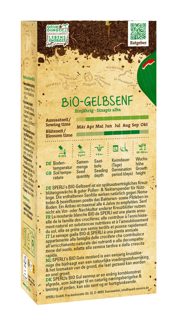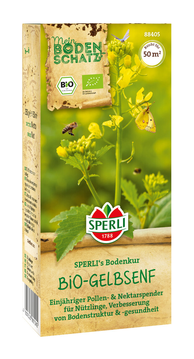 SPERLI's BIO-Gelbsenf ist ein einjähriges Kreuzblütengewächs, das als Gründünger angebaut zur natürlichen Nährstoffanreicherung und Bodenlockerung beiträgt. Besonders die schnelle Entwicklung der Pflanze und die spätsaatverträglichkeit machen die Pflanze sehr Interessant. Des weiteren vermindet der dichte Pflanzenbestand das Aufkommen von Unkräutern und schützt den Boden vor Austrocknung, Verschlämmung und Nährstoffauswaschungen. Die in ihm enthaltenden Senföle wirken gegen Nematoden und beeinflussen positiv das Bakterien- und Pilzleben. Gelbsenf darf niemals vor oder nach Kulturen von Kreuzblütlern (z.B. Kohl) erfolgen. Es sollte eine Anbaupause von mind. 4 Jahren eingehalten werden. Guter Pollen- & Nektarspender für Nützlinge.