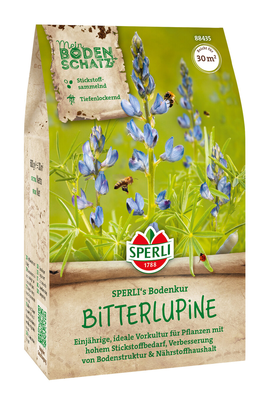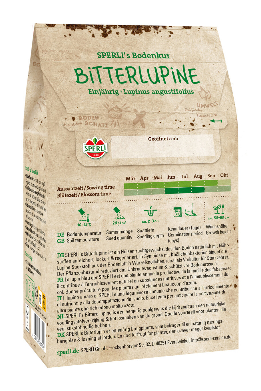 SPERLI's Bitterlupine ist einjährig und gehört in die Familie der Hülsenfrüchtler, die als Gründünger angebaut zur natürlichen Nährstoffanreicherung und Bodenlockerung beitragen. Sie leben in Symbiose mit Knöllchenbakterien, welche in der Lage sind, Stickstoff aus der Bodenluft zu binden. Durch Einarbeitung der Pflanze in den Boden wird dieser zusätzliche Sticksoff für nachfolgende Kulturen verfügbar. Des weiteren vermindet der dichte Pflanzenbestand das Aufkommen von Unkräutern und schützt den Boden vor Austrocknung, Verschlämmung und Nährstoffauswaschungen. Der Anbau eignet sich besonders als Nachkultur zu Regeneration des Bodens oder als Vorkultur für Gemüse mit hohem Stickstoffbedarf (z.B. Kohl). Es sollte eine Anbaupause von 5-7 Jahren eingehalten werden. Staunässe und Kalkböden eignen sich nicht so.