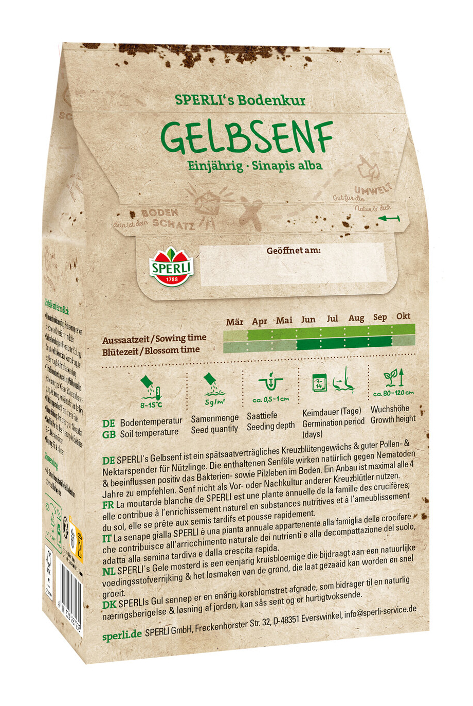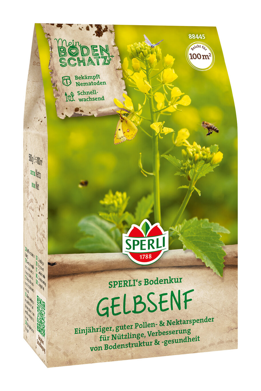 SPERLI's Gelbsenf ist ein einjähriges Kreuzblütengewächs, das als Gründünger angebaut zur natürlichen Nährstoffanreicherung und Bodenlockerung beiträgt. Besonders die schnelle Entwicklung der Pflanze und die spätsaatverträglichkeit machen die Pflanze sehr Interessant. Des weiteren vermindet der dichte Pflanzenbestand das Aufkommen von Unkräutern und schützt den Boden vor Austrocknung, Verschlämmung und Nährstoffauswaschungen. Die in ihm enthaltenden Senföle wirken gegen Nematoden und beeinflussen positiv das Bakterien- und Pilzleben. Gelbsenf darf niemals vor oder nach Kulturen von Kreuzblütlern (z.B. Kohl) erfolgen. Es sollte eine Anbaupause von mind. 4 Jahren eingehalten werden. Guter Pollen- & Nektarspender für Nützlinge.