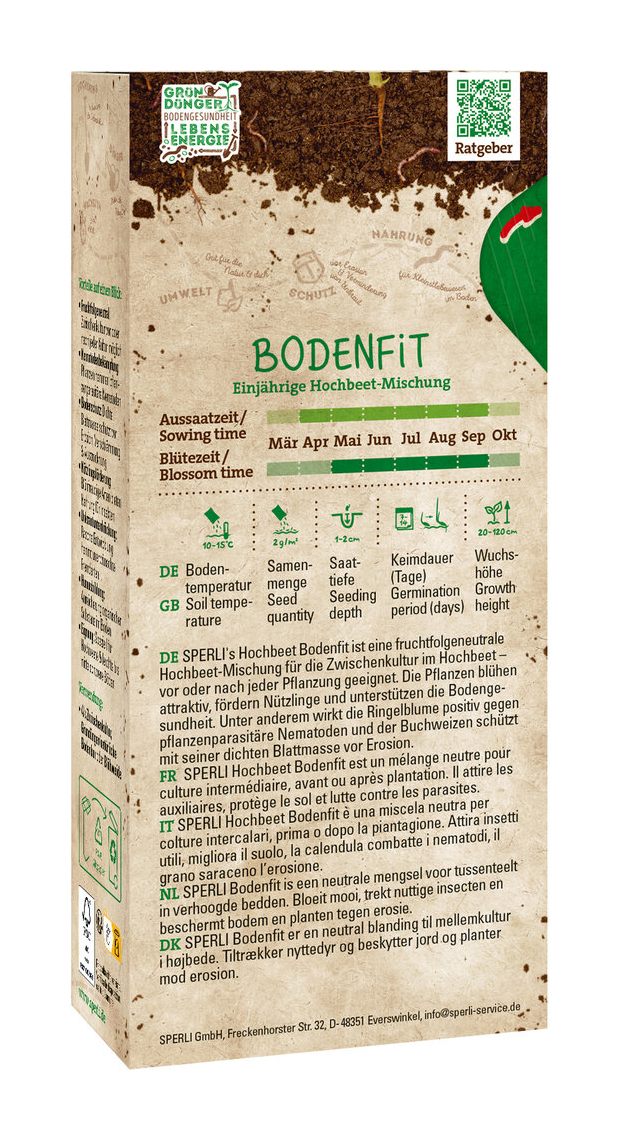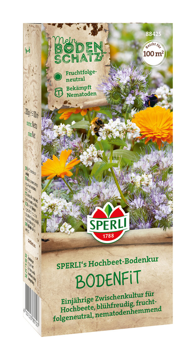 SPERLI's Hochbeet ist eine einjährige, fruchtfolgeneutrale Mischung für die Zwischenkultur im Hochbeet, die sich sich problemlos vor oder nach jeder Hauptkultur aussäen lässt. Die artenreiche Kombination aus blühfreudigen und bodenverbessernden Pflanzen lockert den Boden, unterstützt das Bodenleben und unterdrückt Unkraut. Die Ringelblume wirkt dabei natürlich gegen pflanzenparasitäre Nematoden, während Buchweizen mit seiner dichten Blattmasse den Boden vor Erosion schützt. Die üppige Blüte lockt zahlreiche Nützlinge an und macht die Mischung besonders wertvoll für eine gesunde, nachhaltige Gartenbewirtschaftung im Hochbeet.