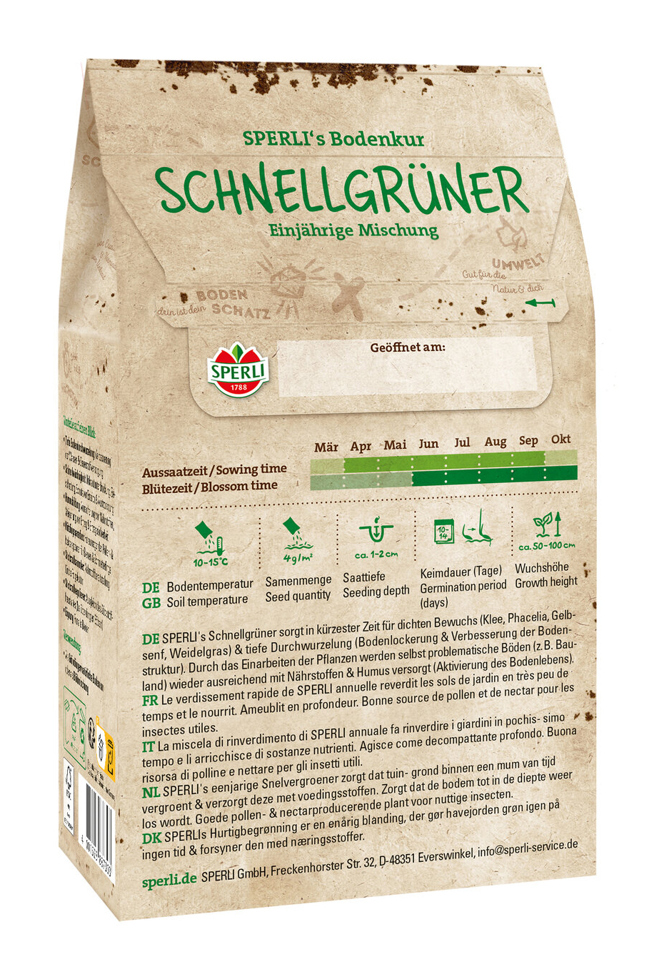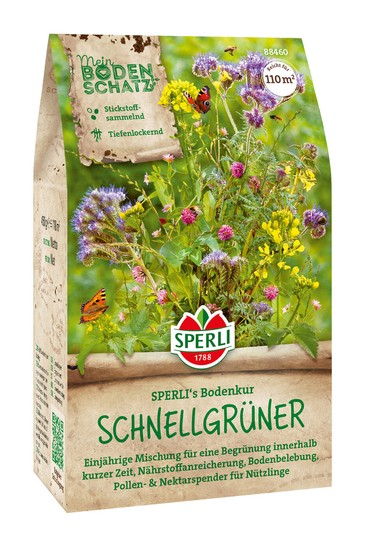 SPERLI's Schnellgrüner ist einjährig und begrünt Gartenböden in kurzer Zeit. Der dichte Pflanzenbestand aus Klee, Phazelia, Gelbsenf und Weidelgras beschattet den Boden, vermindert das Aufkommen von Wildkräutern und schützt den Boden vor Austrocknung, Verschlämmung und der ungehinderten Auswaschung von Nährstoffen. Das tief reichende Wurzelsystem trägt zur Bodenlockerung und damit zur Verbesserung der Bodenstruktur bei. Durch die Einarbeitung des Schnellgrüners in den Boden werden selbst problematische Böden (wie z.B. Bauland) wieder ausreichend mit Nährstoffen und Humus versorgt und dadurch das Bodenleben wieder aktiviert. Der nährstoffreiche Aufwuchs eignet sich auch optimal zur Kompostierung.