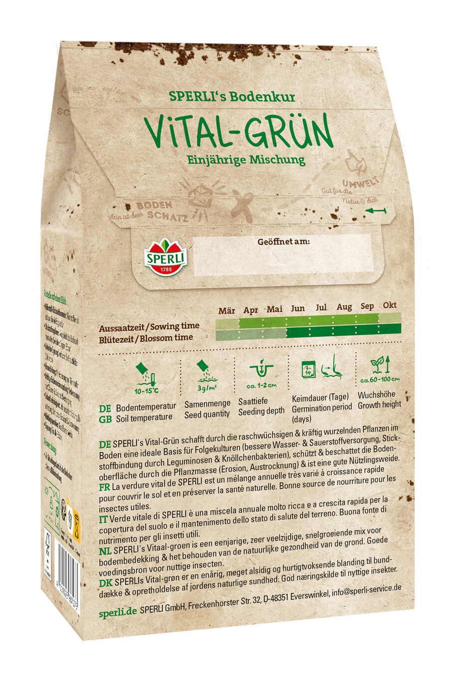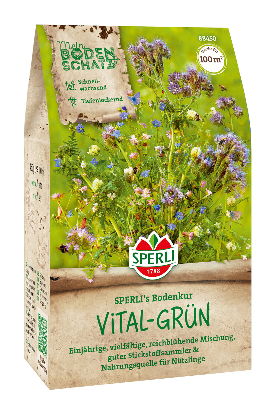 SPERLI's BIO-Vital-Grün für die natürliche Gesunderhaltung des Bodens. Die einjährige Mischung ist sehr vielfältig und raschwüchsig. Durch die tiefe Durchwurzelung entsteht für Folgekulturen eine ideale Basis für gutes Wachstum. Durch den hohen Anteil an Feinleguminosen wird zusätzlicher Stickstoff gebunden und für Folgekulturen bereitgestellt. Die rasche Bodendeckung schützt vor Austrocknung und Bodenerosion. Bei überdüngten Böden kann die Mischung als Stickstoffregulierer eingesetzt werden. Sie ist eine gute Nahrungsquelle für Nützlinge.