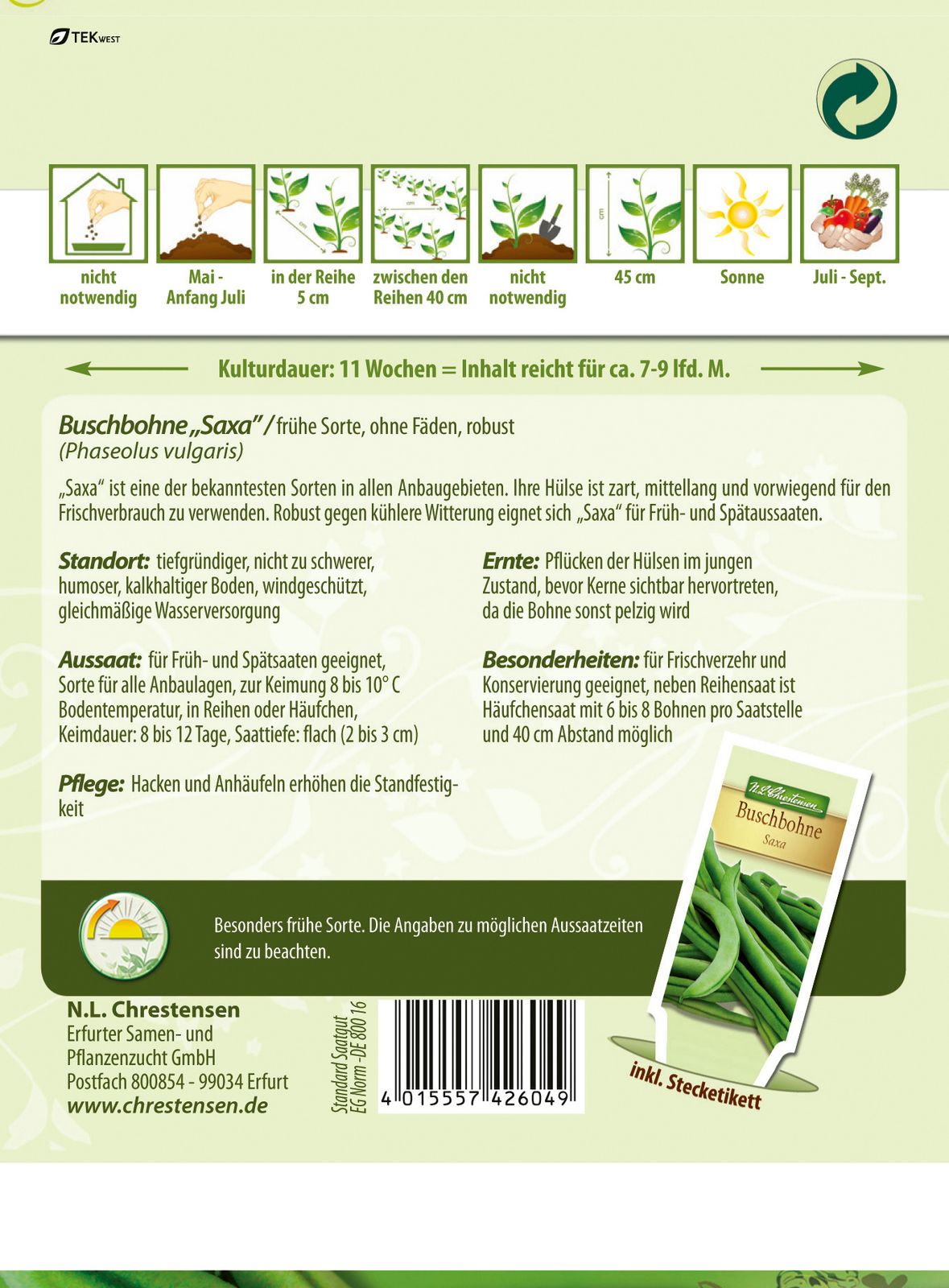 Saxa ist eine der bekanntesten Sorten in allen Anbaugebieten. Ihre Hülse ist zart, mittellang und vorwiegend für den Frischverbrauch zu verwenden. Robust gegen kühlere Witterung, eignet sich Saxa für Früh- und Spätaussaaten. Hacken und anhäufen erhöhen Standfestigkeit.