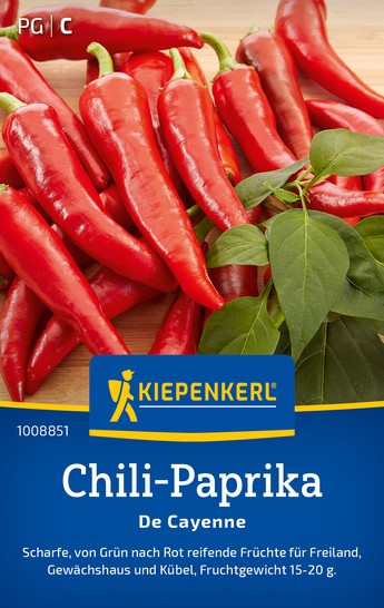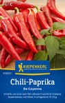 Die Chili-Paprika 'De Cayenne' bildet von Grün nach Rot reifende, 15-20 g schwere Früchte. Cayenne-Chili gehört mit ca. 50.000 Scoville zu den scharfen Chilis. Rote Früchte haben die beste Würzkraft. Für geschützte Stellen im Freiland, Gewächshaus, Hochbeet und Kübel. Wuchshöhe 80-100 cm.