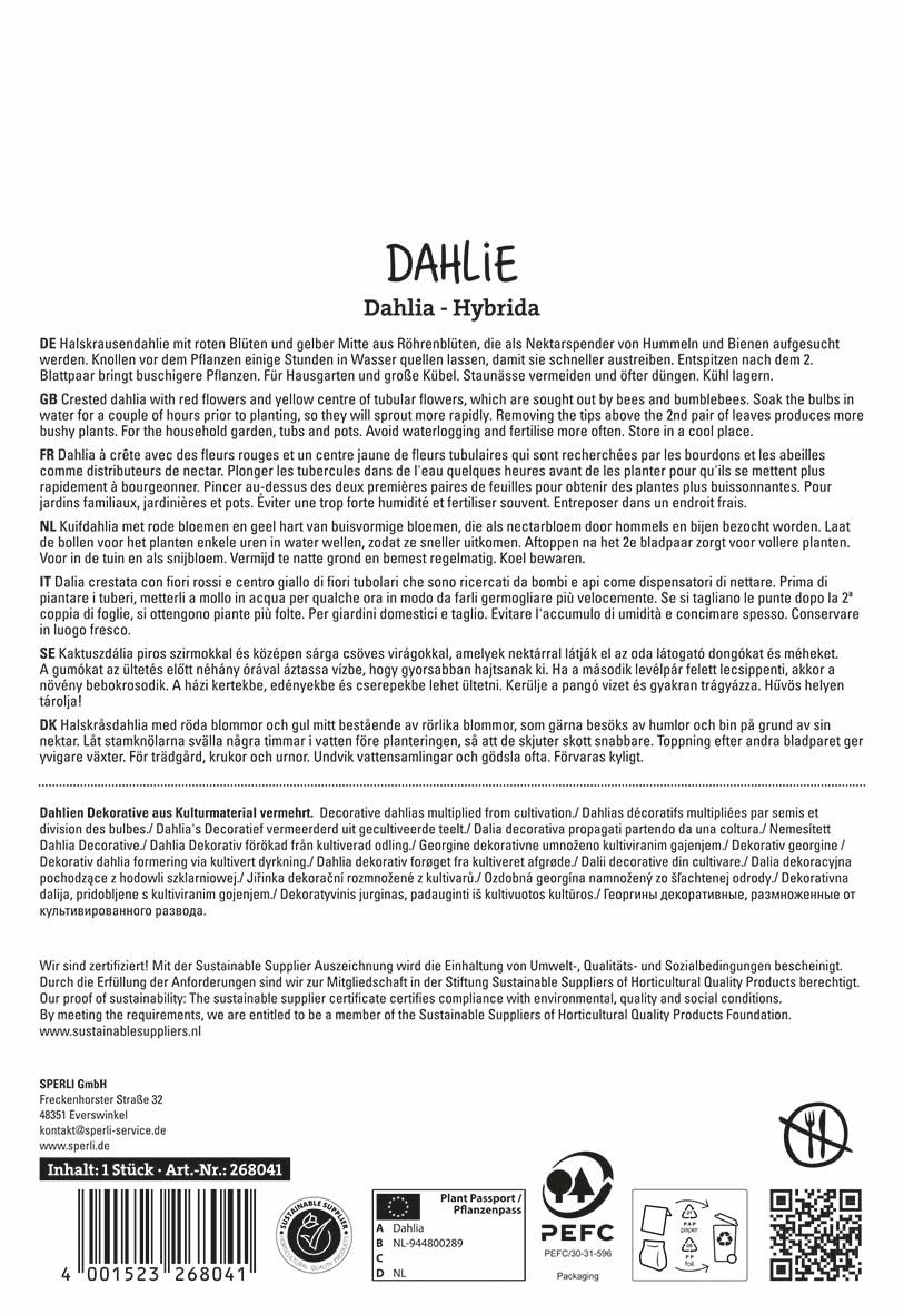 Halskrausendahlie mit roten Blüten und gelber Mitte aus Röhrenblüten, die als Nektarspender von Hummeln und Bienen aufgesucht werden. Knollen vor dem Pflanzen einige Stunden in Wasser quellen lassen, damit sie schneller austreiben. Entspitzen nach dem 2. Blattpaar bringt buschigere Pflanzen. Für Hausgarten und große Kübel. Staunässe vermeiden und öfter düngen. Kühl lagern.