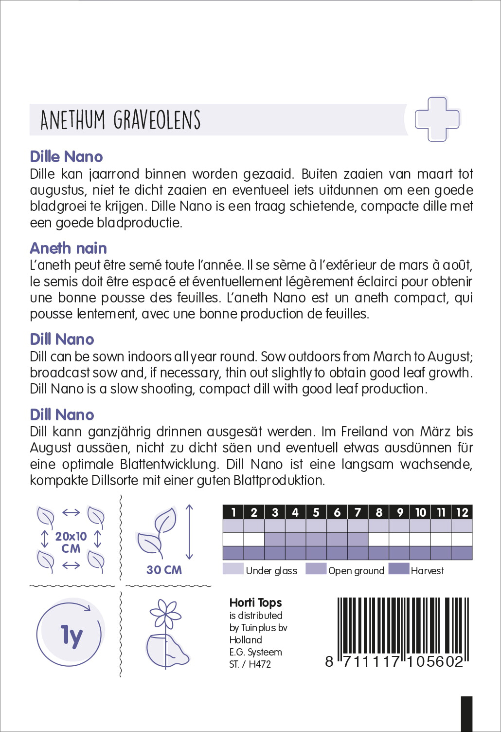 Dill kann ganzjährig drinnen ausgesät werden. Im Freiland von März bis August aussäen, nicht zu dicht säen und eventuell etwas ausdünnen für eine optimale Blattentwicklung. Dill Nano ist eine langsam wachsende, kompakte Dillsorte mit einer guten Blattproduktion.