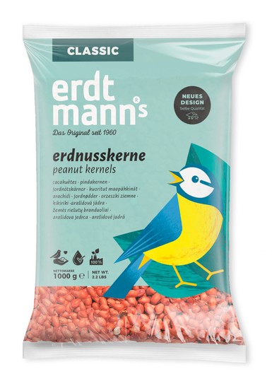 Erdnüsse sind an jeder guten Futterstelle mit dabei. Erdnusskerne versorgen Wildvögel mit viel Kraft und Energie. In ein Vogelhaus oder einfach an eine geschützte Bodenfutterstelle gestreut, sorgen die Erdnüsse für ein geselliges Treffen von Kleibern, Finken, Sperlingen und vielen anderen Singvögeln. Das Futter hinterlässt keine Schalenrückstände und ist gut für eine saubere Futterstelle. Auch für Eichhörnchen geeignet.