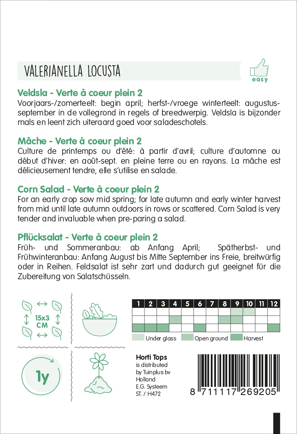 Früh- und Sommeranbau: ab Anfang April; Spätherbst- und Frühwinteranbau: Anfang August bis Mitte September ins Freie, breitwürfig oder in Reihen. Feldsalat ist sehr zart und dadurch gut geeignet für die Zubereitung von Salatschüsseln.