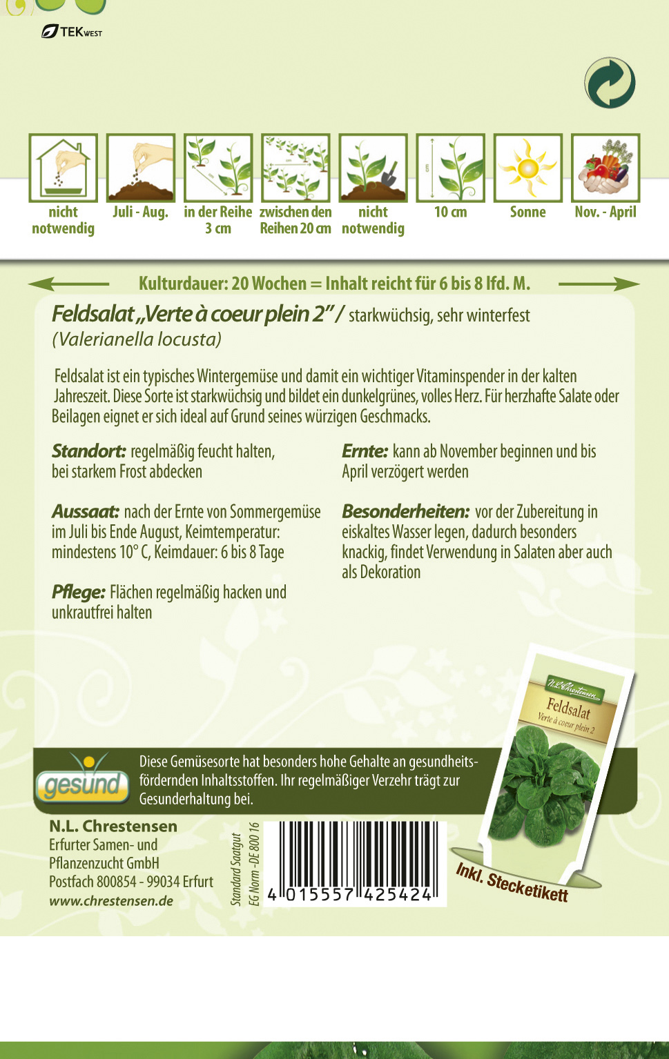 Feldsalat ist ein typisches Wintergemüse und damit ein wichtiger Vitaminspender in der kalten Jahreszeit. Diese Sorte ist starkwüchsig und bildet ein dunkelgrünes, volles Herz. Für herzhafte Salate oder Beilagen eignet er sich ideal auf Grund seines würzigen Geschmacks.Flächen regelmäßig hacken und unkrautfrei halten.