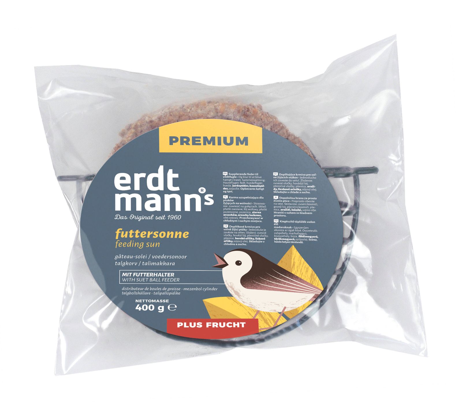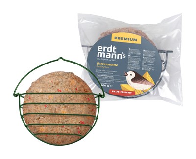 Erdtmanns Futtersonne PLUS ist eine ganz besondere Form des Wildvogelfutters: Die bewährte Meisenknödel-Rezeptur wurde erweitert um ein PLUS an Früchten und in eine neue Form gepresst. Das Plus besteht aus Rosinen, Holunderbeeren, Äpfel, Hagebutten und Ebereschenbeeren. Zusammen mit der Halterung können Sie Ihre fliegenden Gartenbesucher nun noch pflegleichter und nachhaltiger füttern. Die Futtersonne einfach hineinstecken, aufhängen und viel Freude damit haben. Es bleiben natürlich keine Netze zurück.