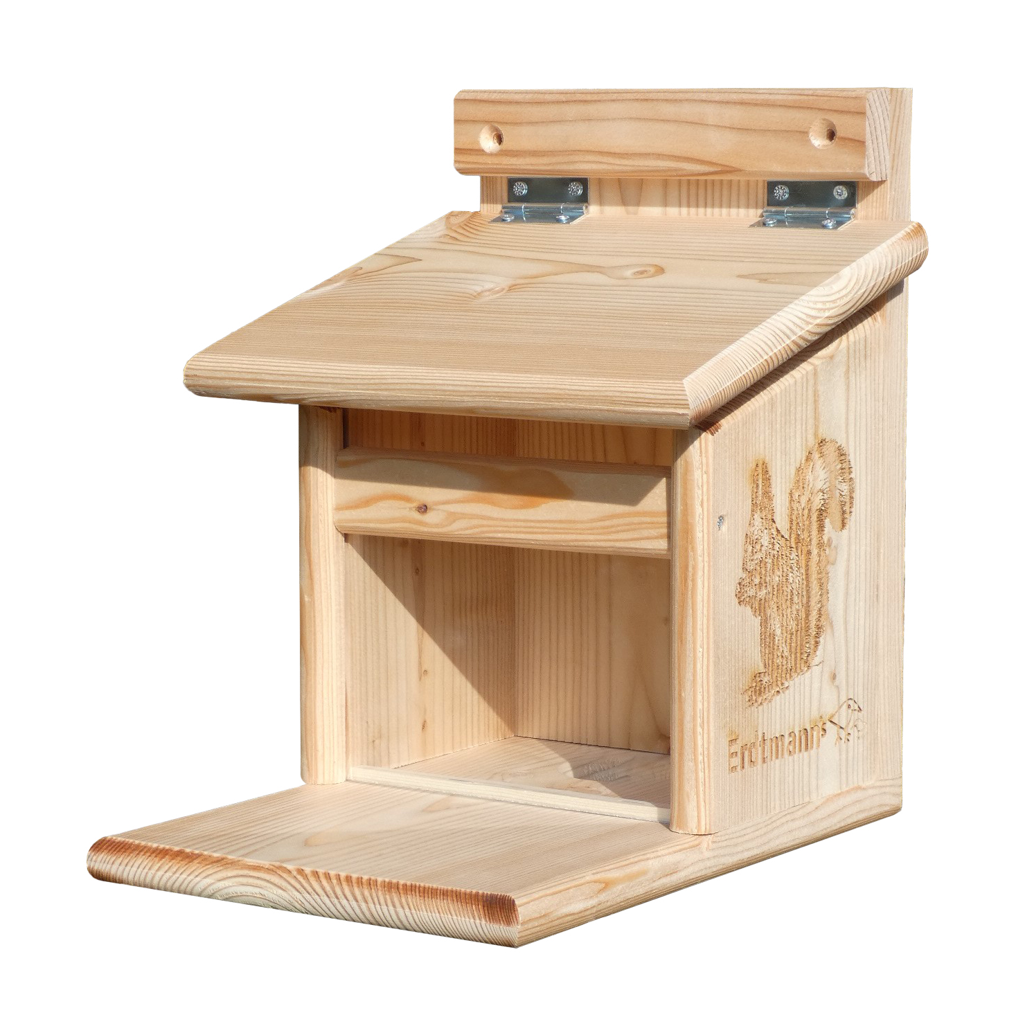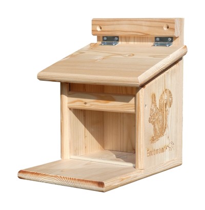 Mit unserem Futterspender für Eichhörnchen können Sie den kleinen Nagern in Ihrem Garten das Futter perfekt anbieten. Die Futterstation ist aus witterungsbeständigem Lärchenholz hergestellt. Die leckeren Knabbereien sind dank der Dachklappe optimal vor Regen geschützt. Zwei hochwertige Scharniere fixieren den Deckel, um Wackeln oder Verklemmen des Deckels zu verhindern.