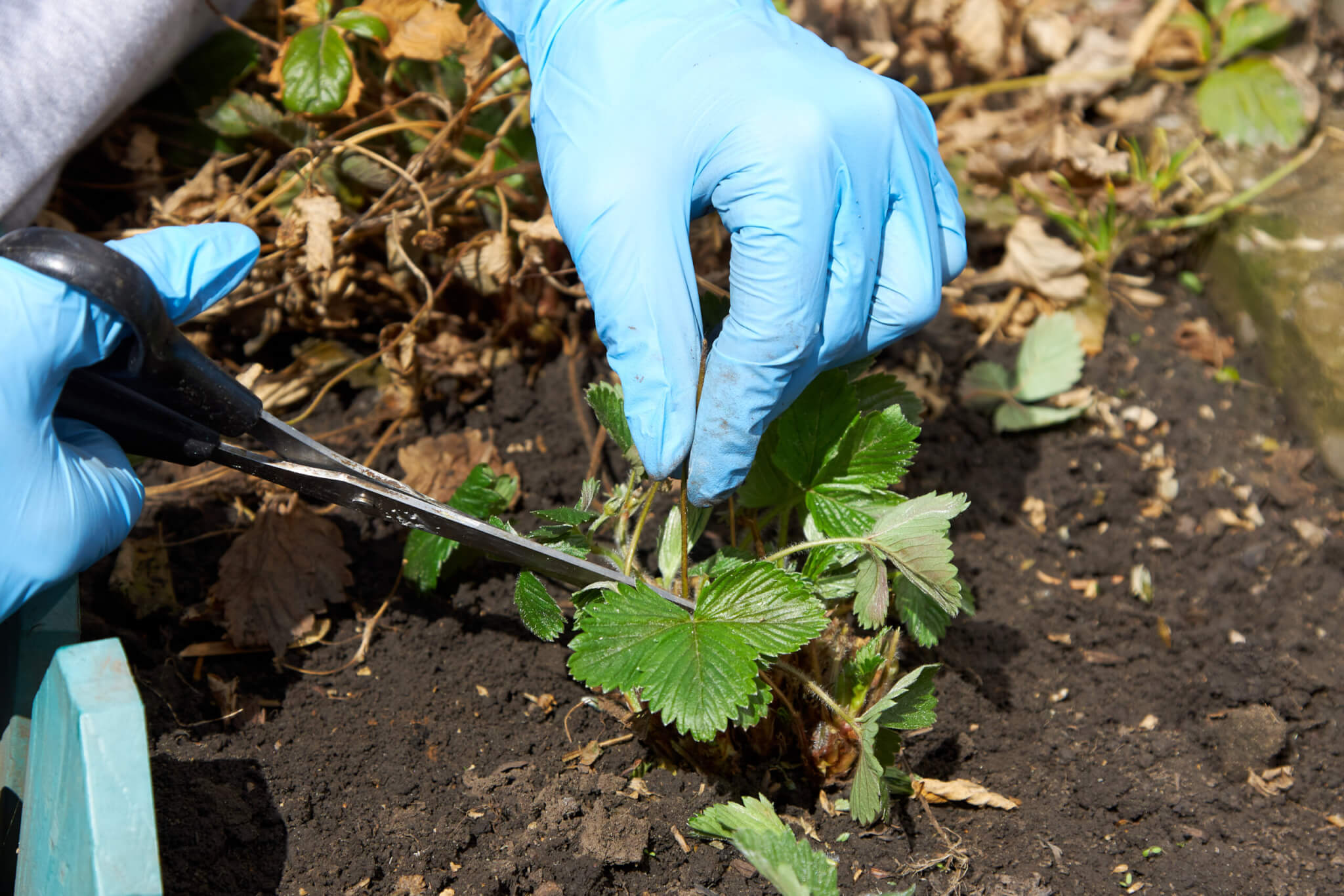 Rückschnitt von Erdbeeren: äußere Blätter und Ranken entfernen