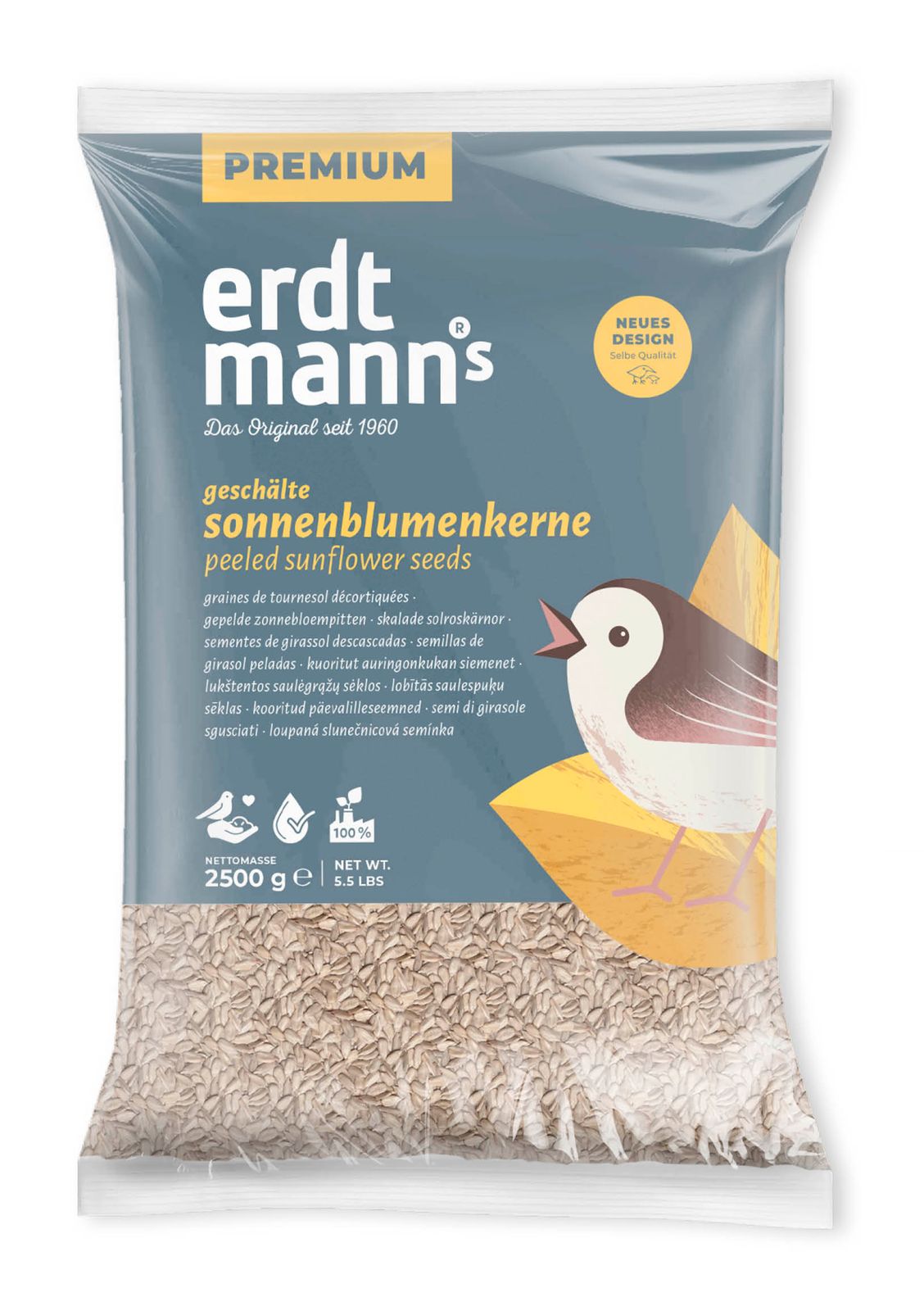 Die geschälten Sonnenblumenkerne sind eine Delikatesse für Wildvögel. Sie stammen aus Erdtmanns Premium-Reihe. Sie bieten das Beste des Kerns ohne Schalenrückstände am Futterplatz. Es lockt Eichelhäher, Kleiber, Meisen, Kernbeißer, Sperlinge, Zeisige und Spechte an Ihre Futterstelle. Einfach in ein Vogelhaus oder an eine geschützte Bodenfutterstelle streuen.