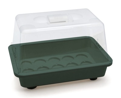 Im Format 29x19x19 cm bietet das kleine stabile Gewächshaus mit der glasklaren Haube ideale Bedingungen auch auf kleinstem Raum. Der Belüftungsregler in der Haube sorgt zusammen mit den seitlichen Belüftungslöchern für das ideale Wachstums-Klima. Mit 15 Vertiefungen im Boden und Rinnen für eine optimale Wasserverteilung ist Nino ideal für die Verwendung mit den Romberg
