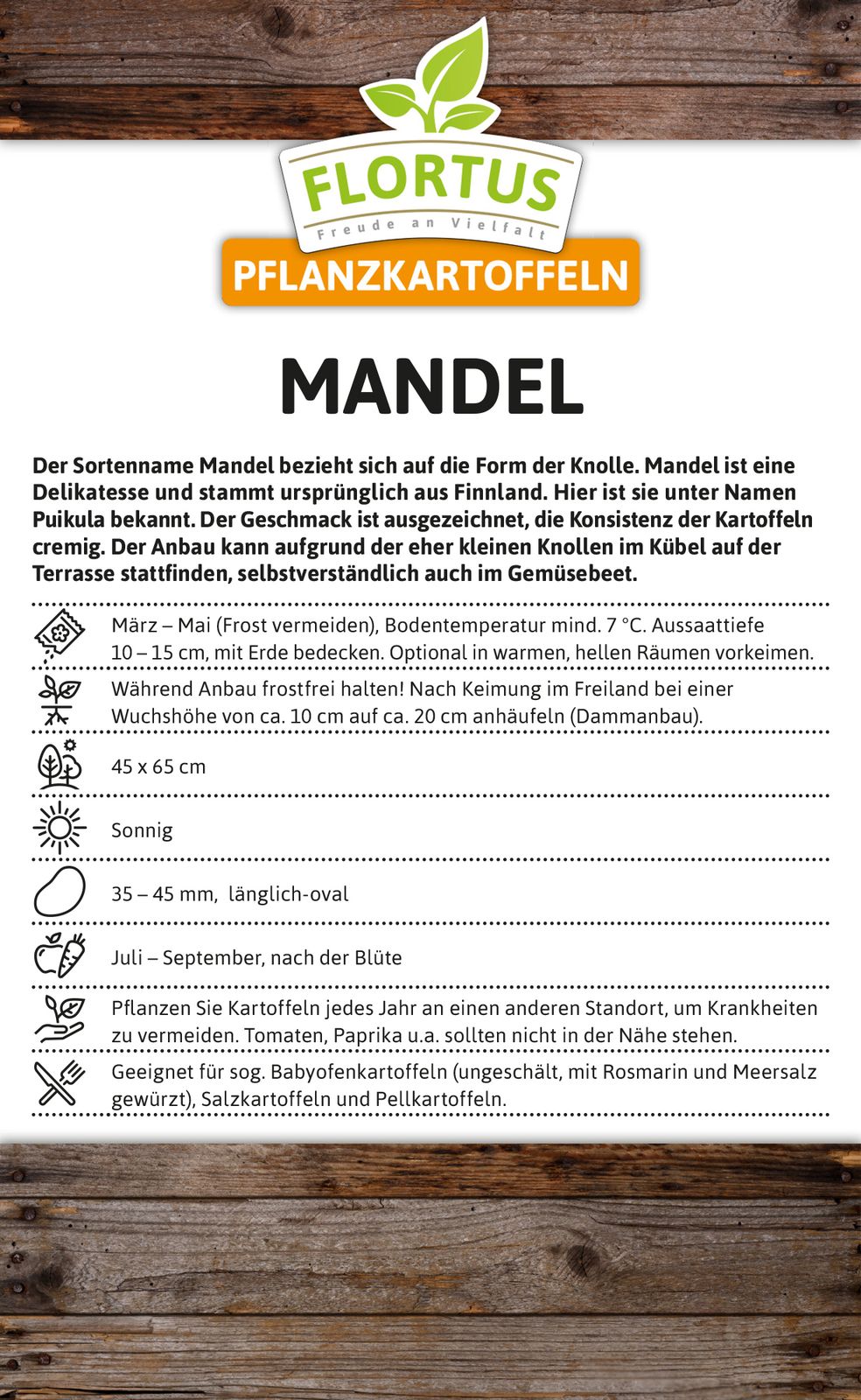 Der Sortenname Mandel bezieht sich auf die Form der Knolle. Mandel ist eine Delikatesse und stammt ursprünglich aus Finnland. Hier ist sie unter Namen Puikula bekannt. Der Geschmack ist ausgezeichnet, die Konsistenz der Kartoffeln cremig. Der Anbau kann aufgrund der eher kleinen Knollen im Kübel auf der Terrasse stattfinden, selbstverständlich auch im Gemüsebeet.