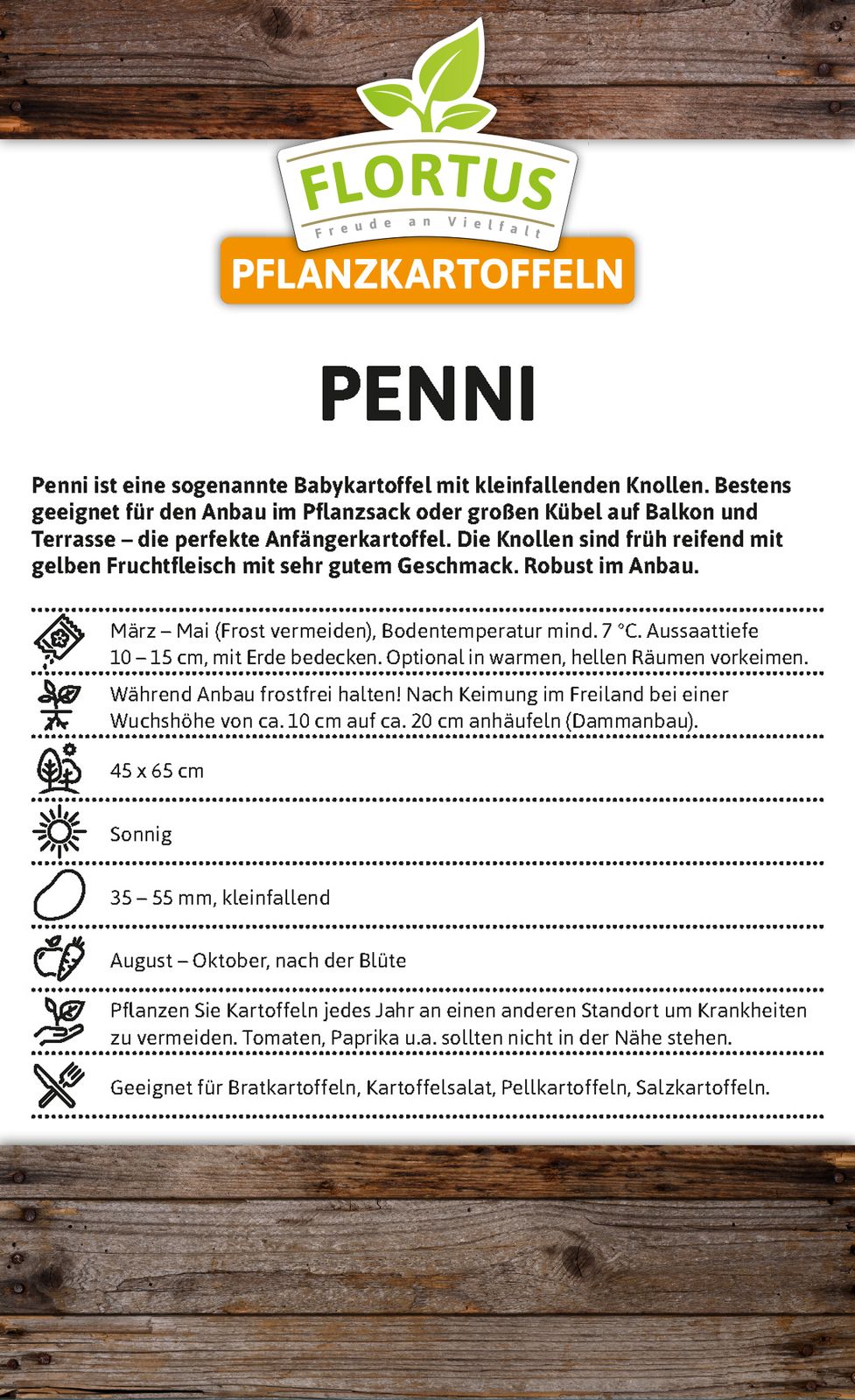 Penni ist eine sogenannte Babykartoffel mit kleinfallenden Knollen. Bestens geeignet für den Anbau im Pflanzsack oder großen Kübel auf Balkon und Terrasse – die perfekte Anfängerkartoffel. Die Knollen sind früh reifend mit gelben Fruchtfleisch mit sehr gutem Geschmack. Robust im Anbau.