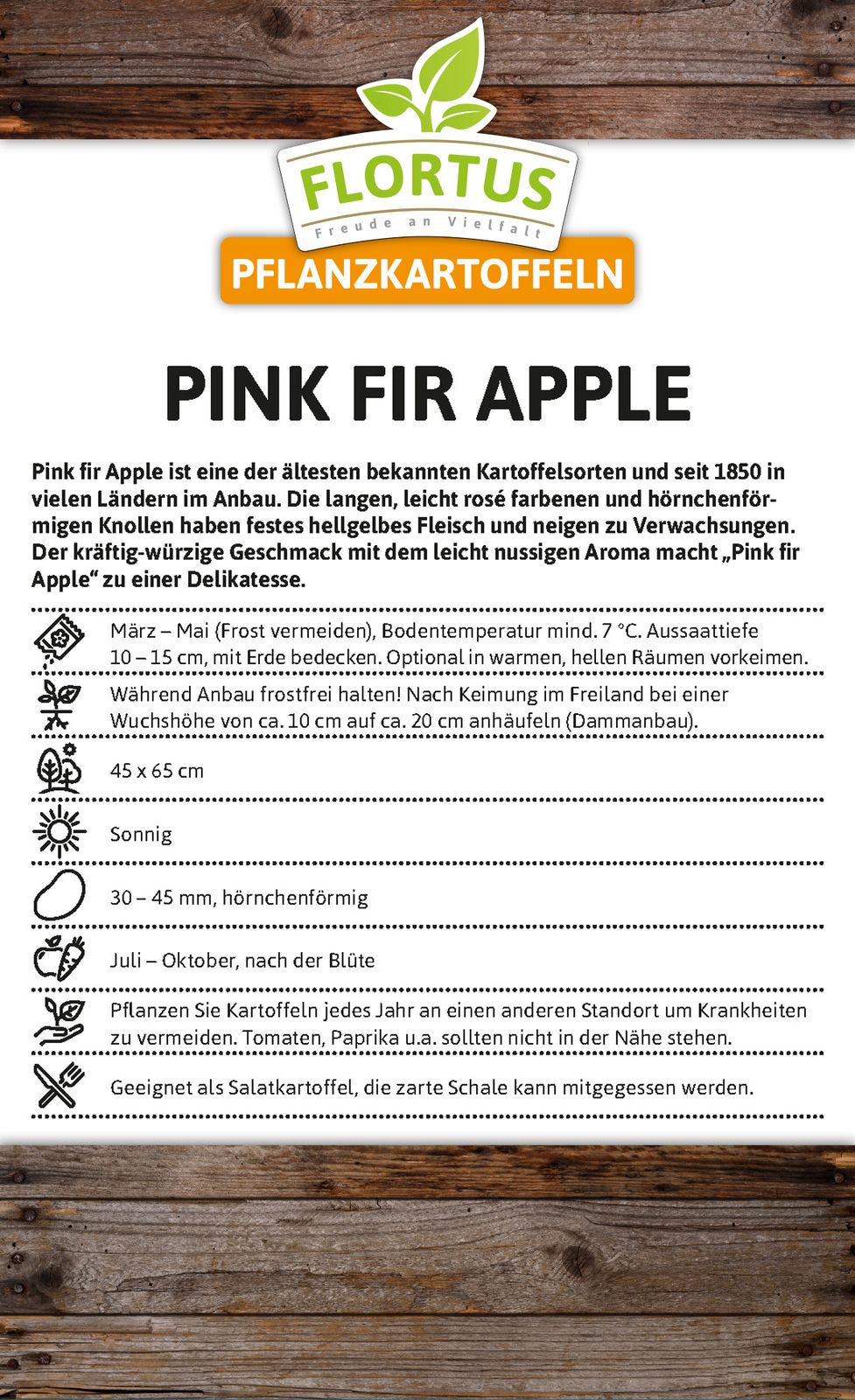Pink fir Apple ist eine der ältesten bekannten Kartoffelsorten und seit 1850 in vielen Ländern im Anbau. Die langen, leicht rosé farbenen und hörnchenförmigen Knollen haben festes hellgelbes Fleisch und neigen zu Verwachsungen. Der kräftig-würzige Geschmack mit dem leicht nussigen Aroma macht „Pink fir Apple“ zu einer Delikatesse.