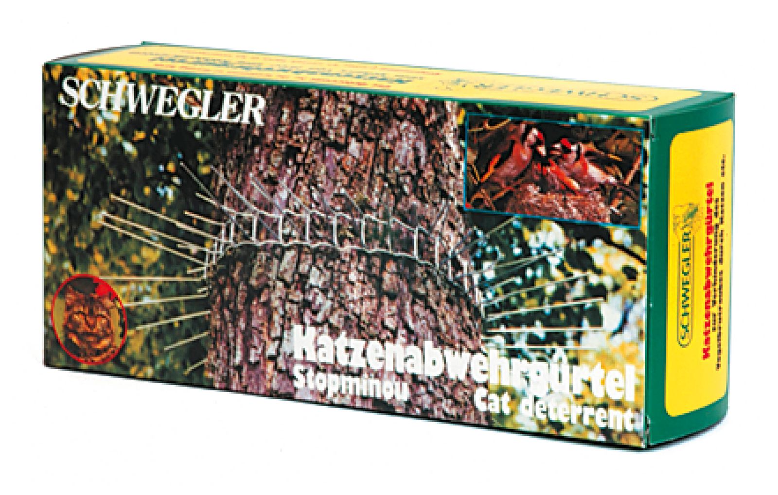 Der Katzenabwehrgürtel verhindert, dass eine Katze auf den Baum klettert und Nester plündern oder den Futterhausbesuchern auflauern kann, ohne für die Katze gefährlich zu sein. Aus Stahlhaken, bis 70 cm und 115 cm Baumumfang