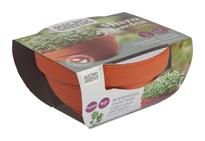 Micro Garden Terracotta Bowl ist ein einfaches Zuchtset für die ganzjährige Aussaat von Microgreens. Lösen Sie die Erdtablette gemäß den Anweisungen auf der Packungsinnenseite auf und streuen Sie die Samen gleichmäßig auf die Erde und bedecken Sie sie mit einer dünnen Schicht Erde. Buzzy Microgreens sind Gemüse und Kräuter, die Sie in jungen Jahren ernten und roh essen, unterteilt in zwei Gruppen; - Mikroblätter: ernten und essen Sie sowohl das Keimblatt als auch den Stängel; der Keim. - Babyblätter: Ernten Sie die Triebe und essen Sie die jungen Blätter. Grünkohl kann nach einer Woche als Mikroblatt geröstet werden. Das Blatt ist butterzart und ideal für die Verwendung in einem Smoothie. Als Baby Leaf lässt man die Pflanze einige Wochen weiterwachsen und das Blatt kann in diversen (Eintopf-)Gerichten (Wraps, Pasta oder Salat) verwendet werden. Grünkohl als Baby Leaf ist lecker zum Anbraten mit Nüssen oder in Kombination mit anderem Gemüse.