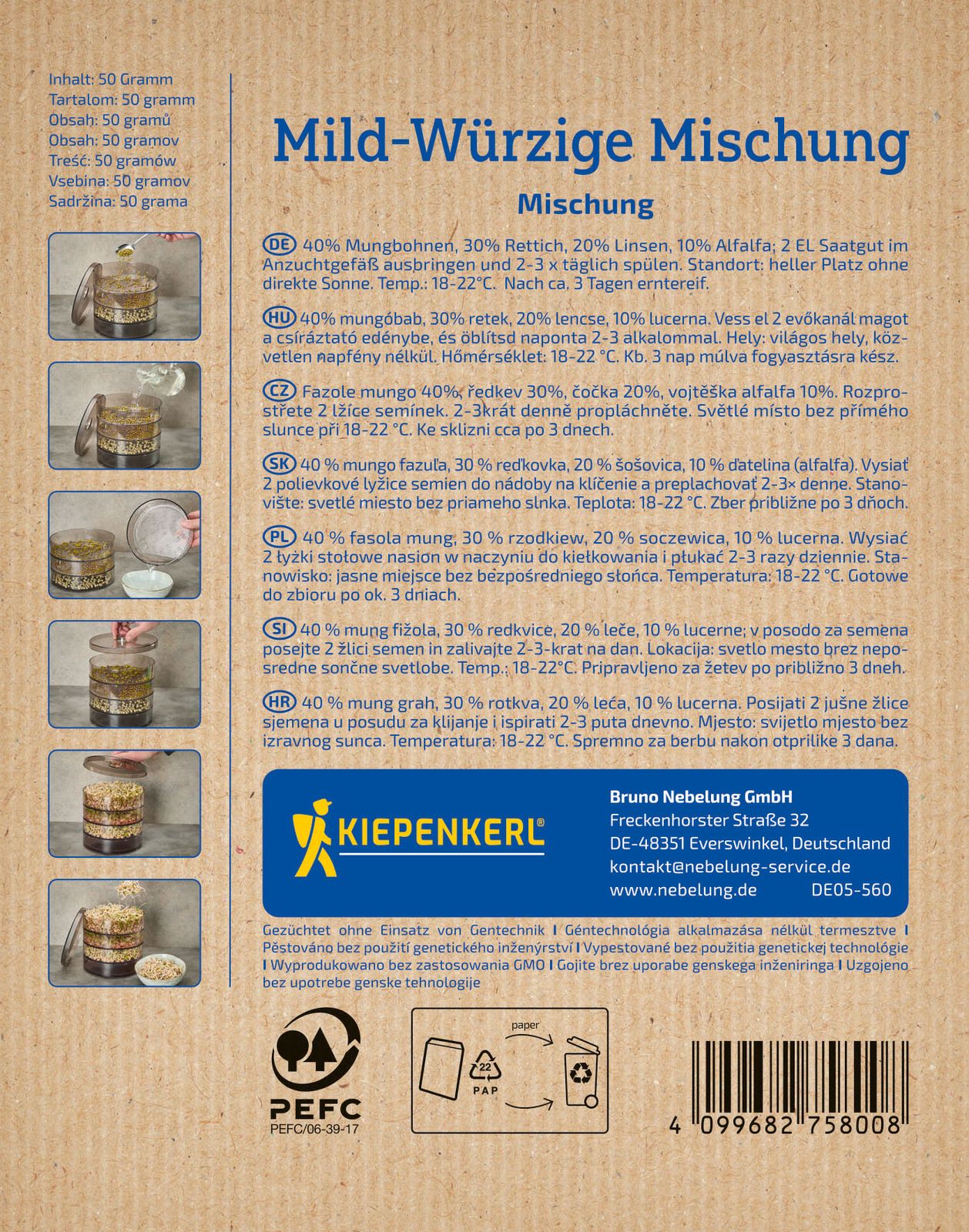 Mild-würziger Geschmack. Mischungszutaten: 70 % Mungbohnen, 30 % Rettich. Anzucht in der Kiepenkerl Sprossenbox: Verteilen Sie je 1 EL Saatgut in eine Schale mit dem Ablaufventil. Nun Wasser hineingeben und ablaufen lassen. Den Deckel aufsetzen und die Sprossenbox an einen hellen Platz ohne direkte Sonne stellen. 2 bis 3 mal täglich bis zur Ernte spülen. Optimale Temperatur: 1821 °C. Verzehrfertig in 3 bis 5 Tagen.