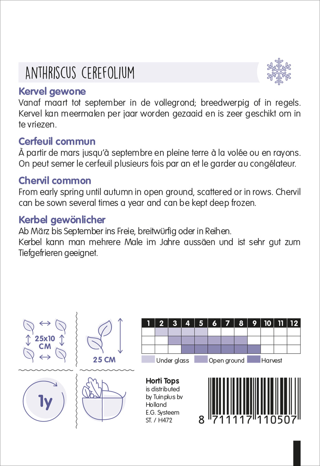 Ab März bis September ins Freie, breitwürfig oder in Reihen. Kerbel kann man mehrere Male im Jahre aussäen und ist sehr gut zum Tiefgefrieren geeignet.
