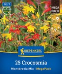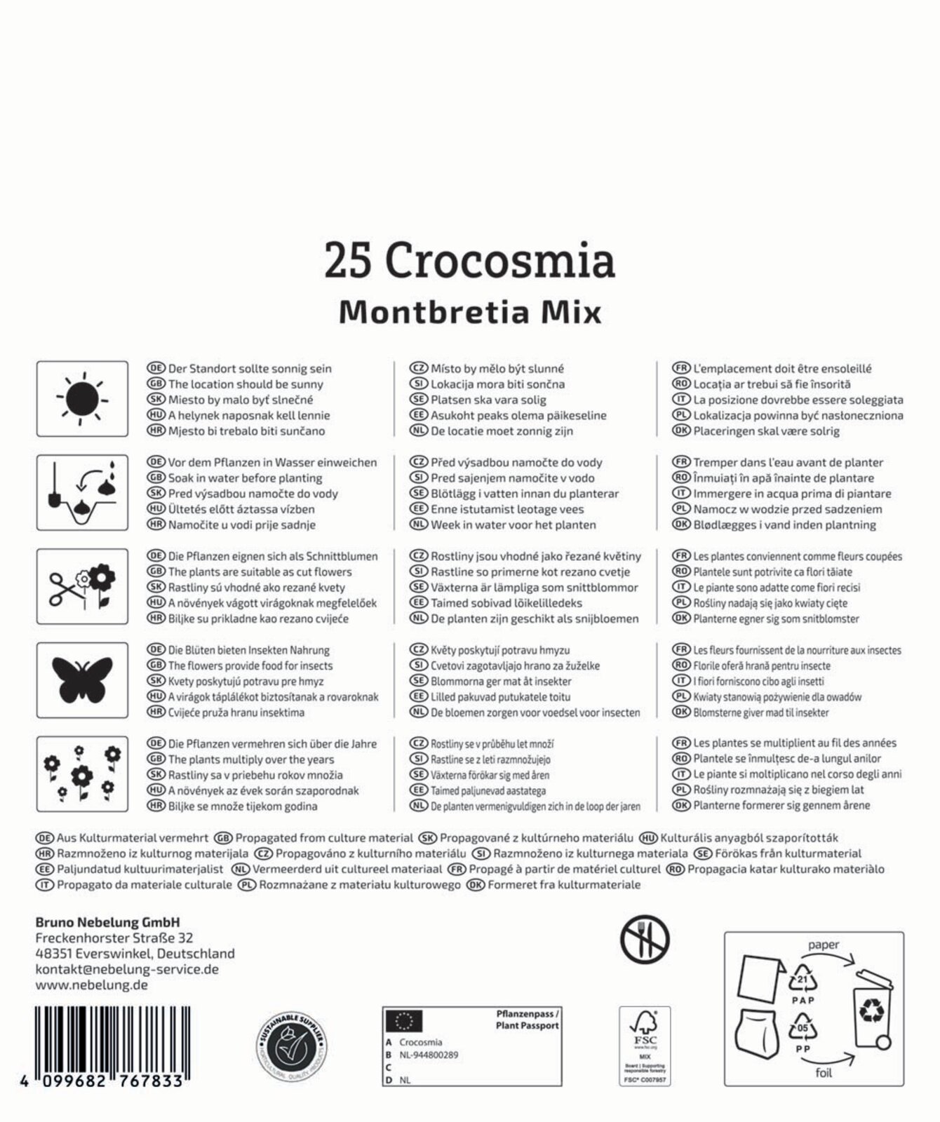 Die Garten-Montbretien sind Kulturhybriden aus der Gold-Montbretie und der Potts-Montbretie. Die Pflanzen können bis zu 90 cm hoch werden und bilden dichte Horste aus aufrechten, schwertförmigen Blättern. Die Blüten sind trichterförmig und sitzen in langen überhängenden Rispen. Diese robuste Montbretien-Mischung blüht in orangen und roten Tönen. Die Blütenstände eigen sich für den Vasenschnitt.