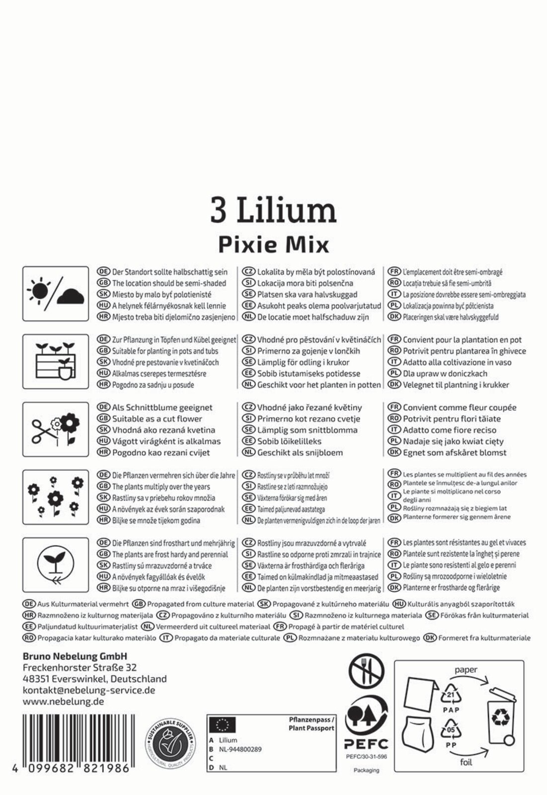 Asiatische Lilien-Hybrid Mischung in bunten Farben. Wegen des gedrungenen Wuchses bestens geeignet für Kübel, Töpfe und niedrige Beete.