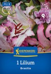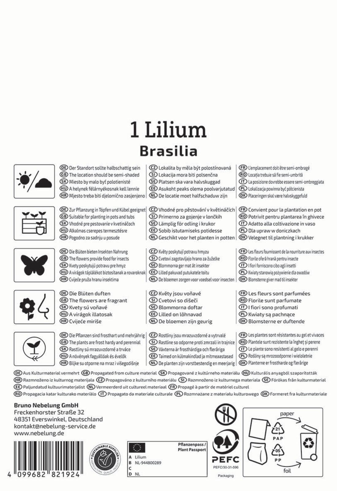 Brasilia gehört zu den Orientalischen Lilien. Sie hat duftende, große, weiße Blüten mit rosa Saum und rosa gesprenkeltem Zentrum von dem sich die die grünen Staubfäden und der grüne Stempel deutlich abheben. Die Pflanzen werden 100110 cm hoch und sollten mit einem Stab gestützt werden um Schäden durch Wind zu vermeiden. Die Sorte ist gut für den Vasenschnitt geeignet. Die Blütezeit liegt im Juli bis August.