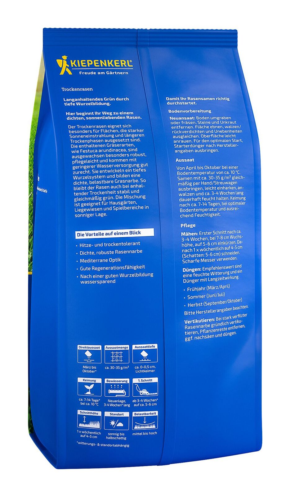 Mit dem Trockenrasen von Kiepenkerl schaffen Sie eine dauerhaft grüne, widerstandsfähige Rasenfläche auch bei starker Sonneneinstrahlung und längeren Trockenphasen. Die speziell ausgewählten Gräserarten, wie Festuca arundinacea, entwickeln ein tiefes Wurzelsystem und sind besonders robust sowie pflegeleicht. So bleibt Ihr Rasen auch bei geringer Wasserversorgung standfest, belastbar und gleichmäßig grün. Ideal für Hausgärten, Liegewiesen und Spielbereiche in sonniger Lage – für alle, die sich einen vitalen, pflegeleichten Rasen wünschen, der auch den Sommer meistert.