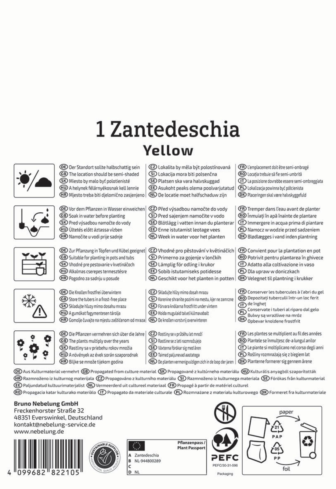 Calla zantedeschia Die Calla eignet sich als Garten- und Topfpflanze und ist eine dekorative Rabattenpflanze. Pflanzen Sie die Blumenzwiebeln an einer sonnigen oder halbschattigen Stelle ein. Mit 10 cm Erde bedecken und einen Pflanzabstand von 15 cm einhalten. Mit diesen Blumen lässt sich auch ein elegantes Bukett zusammenstellen.
