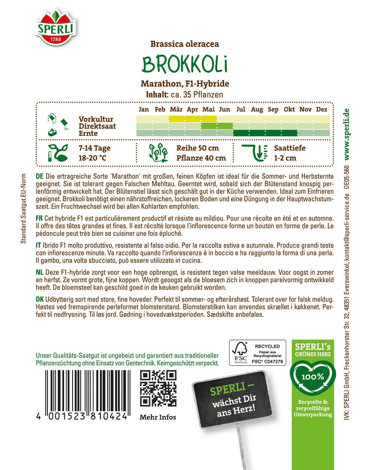 Diese F1 - Hybride ist sehr ertragreich für die Sommer - und Herbsternte und bildet große, feine Köpfe aus. Gute Haltbarkeit nach der Ernte. Geerntet wird, wenn sich der Blütenstand knospig entwickelt hat.