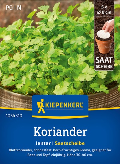 Der Koriander 'Jantar' ist eine blattreiche, wüchsige Sorte, die erst spät Blüten ansetzt. Verwendet werden die jungen, herbfruchtigen Blätter zum Würzen von orientalischen Gerichten und Salaten. Frisch verwenden, zum Konservieren portionsweise einfrieren oder als Pesto zubereiten.