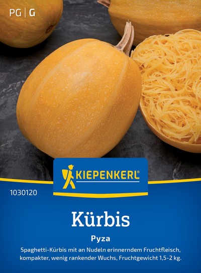 Der Spaghetti-Kürbis 'Pyza' bildet ovale, bei Reife gelbe, 1,5-2 kg schwere Früchte. Das gelbe Fruchtfleisch zerfällt beim Kochen in Fasern die Spaghetti ähneln. Diese werden als mild-würzige, vegane Nudeln gekocht oder gebacken. Die Pflanzen haben einen mittelstarken, rankenden Wuchs. Wuchshöhe 50-60 cm.