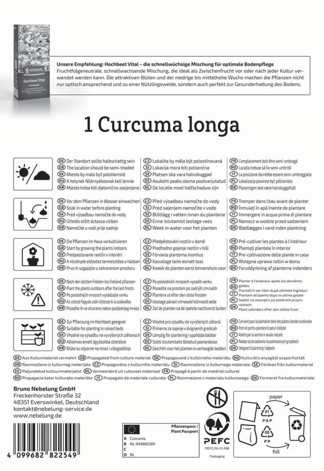 Die Kurkuma 'Curcuma longa' wird im März oder April gepflanzt. Sie gedeiht sowohl in Töpfen als auch in Kübeln. Besonders flache Schalen bieten sich zur Aufzucht an. Wichtig ist die Wahl eines halbschattigen Standortes, der warm ist und eine passende Luftfeuchtigkeit bietet. So sind Wintergärten und Gewächshäuser die ideale Umgebung für die Kultur von Kurkuma. Ideal ist eine Umgebungstemperatur von 18 bis 22 °C. Auf jeden Fall sollte die Temperatur nicht 12 °C unterschreiten. Die Kurkuma sollte mit kalkarmem Wasser gegossen werden. Kurkuma wird bereits seit mehr als 5000 Jahren als Heil- und Gewürzpflanze genutzt. Im Juli und August zeigen sich die hübschen weißen und lilafarbenen Blüten der Kurkuma. So stellt 'Curcuma longa' nicht nur eine Nutzpflanze, sondern auch eine exotische Zierpflanze dar. Die Blüten dieser Sorte duften herrlich. Die Pflanzen werden bis zu 1 m hoch. Da die Sorte mehrjährig angebaut werden kann, hat man lange Freude an der interessanten Pflanze. Die Kurkuma ist nicht winterhart.