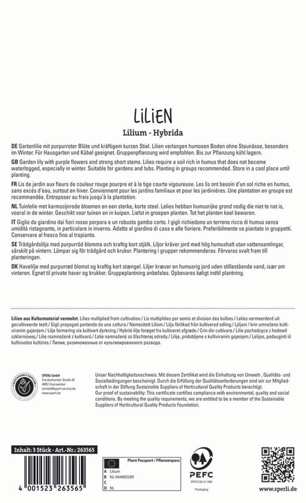 Gartenlilie mit purpurroter Blüte und kräftigem kurzen Stiel. Lilien verlangen humosen Boden ohne Staunässe, besonders im Winter. Für Hausgarten und Kübel geeignet. Gruppenpflanzung wird empfohlen. Bis zur Pflanzung kühl lagern.