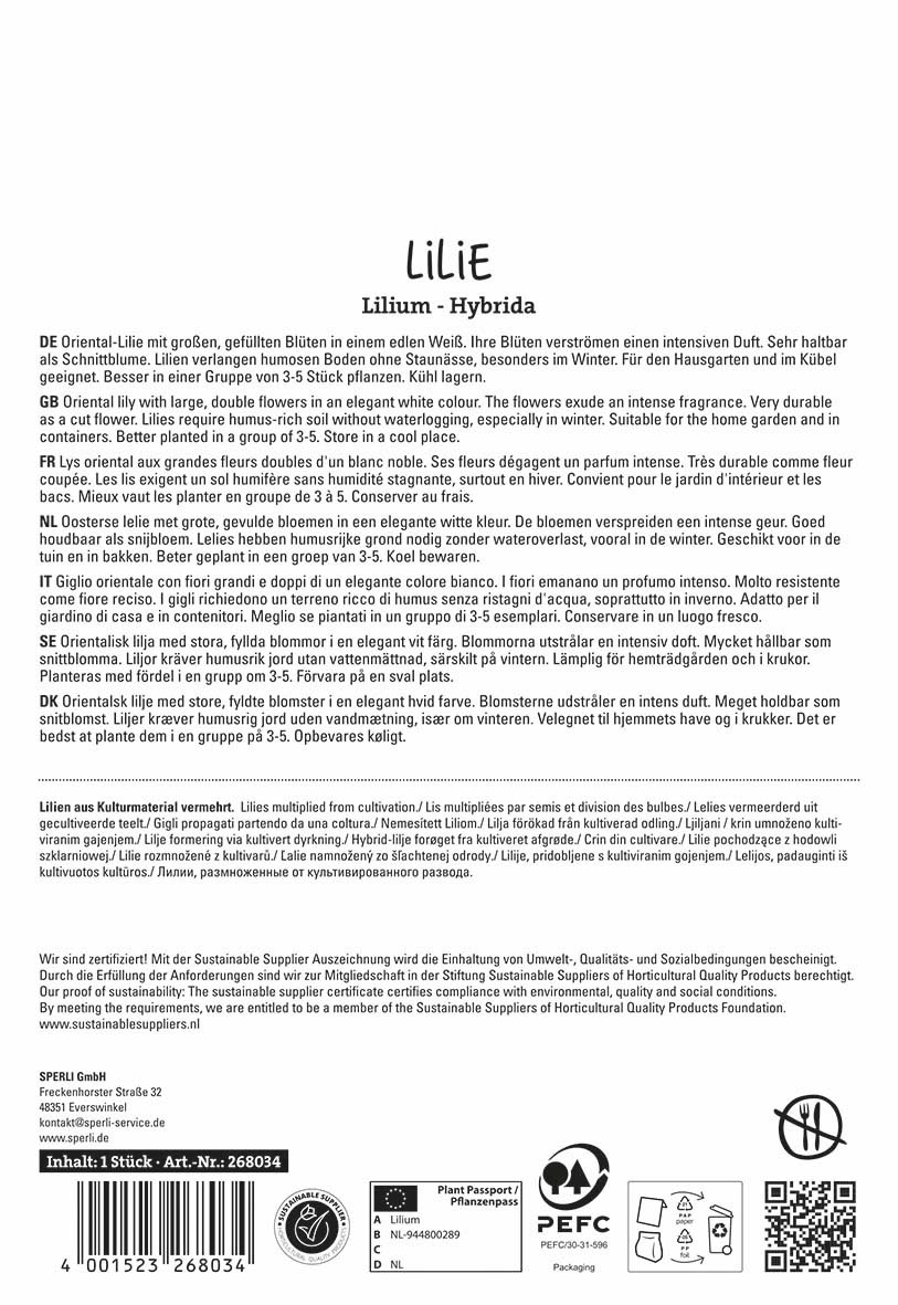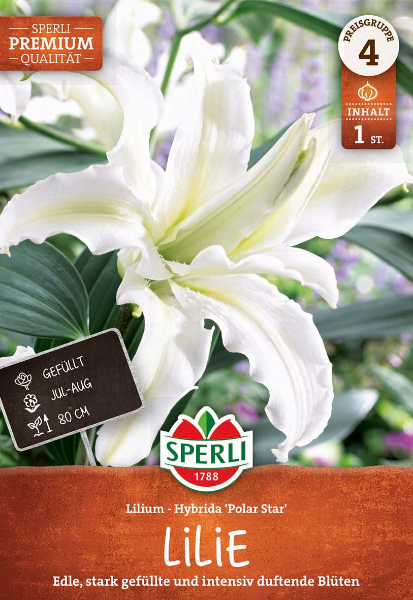 Die Orientalische Lilie `Polar Star` begeistert mit ihren schneeweißen, gefüllten Blüten und ihrem betörenden Duft. Sie erreicht eine Höhe von 80 bis 100 cm und bildet meist 3 bis 5 beeindruckende Blüten mit einem Durchmesser von etwa 20 cm. Ihre Blüten stehen aufrecht, sind weit geöffnet und zeichnen sich durch gewellte Blütenblätter aus.