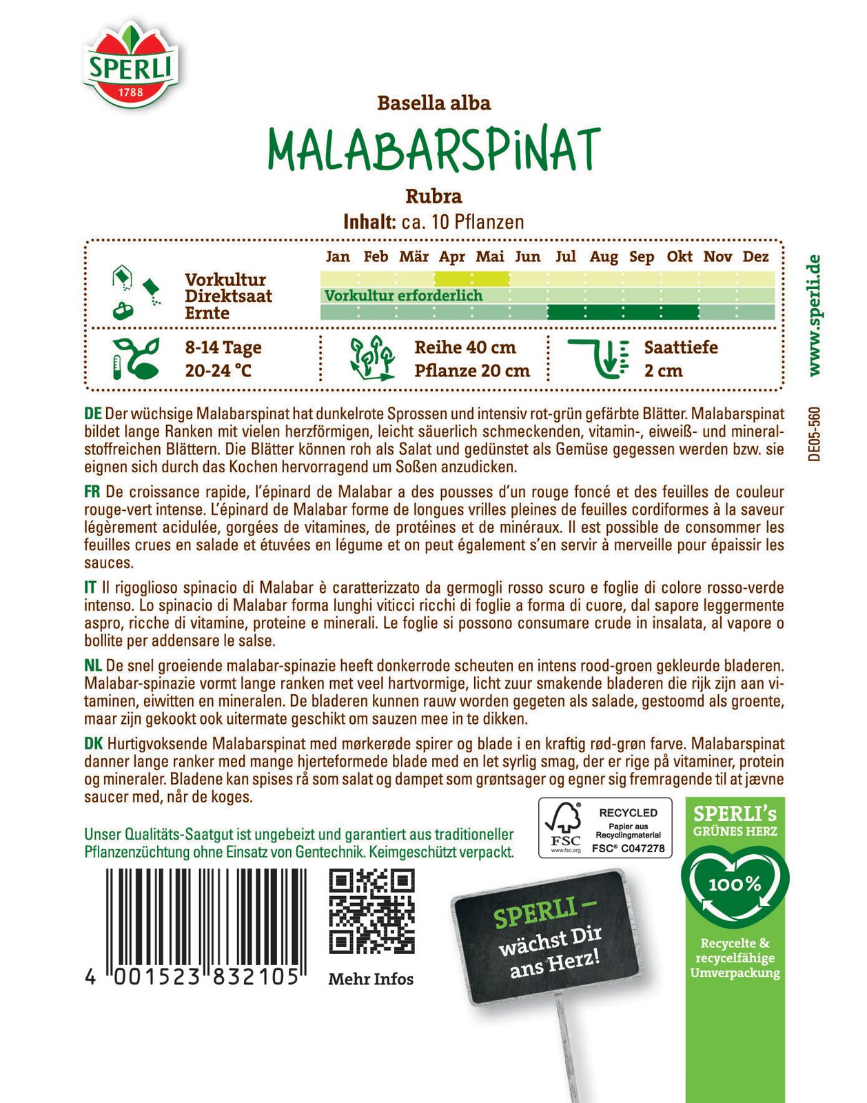 Der wüchsige Malabarspinat hat dunkelrote Sprossen und intensiv rot-grün gefärbte Blätter. Malabarspinat bildet lange Ranken mit vielen herzförmigen, leicht säuerlich schmeckenden, vitamin-, eiweiß- und mineralstoffreichen Blättern. Die Blätter können roh als Salat und gedünstet als Gemüse gegessen werden bzw. sie eignen sich durch das Kochen hervorragend um Soßen anzudicken.