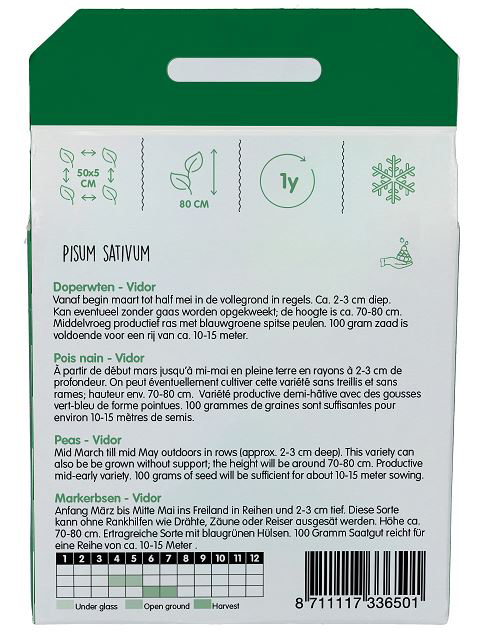 Ertragsreiche Sorte mit blaugrünen Hülsen. Diese Sorte kann ohne Rankhilfen ausgesät werden. 100 g Saatgut reicht für eine Reihe von ca. 10-15 m.